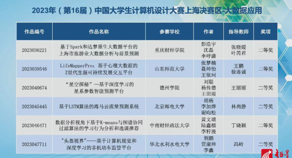 7月20日,2023年(第16届)中国大学生计算机设计大赛国赛决赛“大数据应用”赛项成绩公布,我校讯飞人工智能学院的“基于Spark和达梦原生大数据平台的上海市旅游业大数据分析与前景预测”项目获得国家级二等奖,实现了我校在该赛事上成绩的新突破。