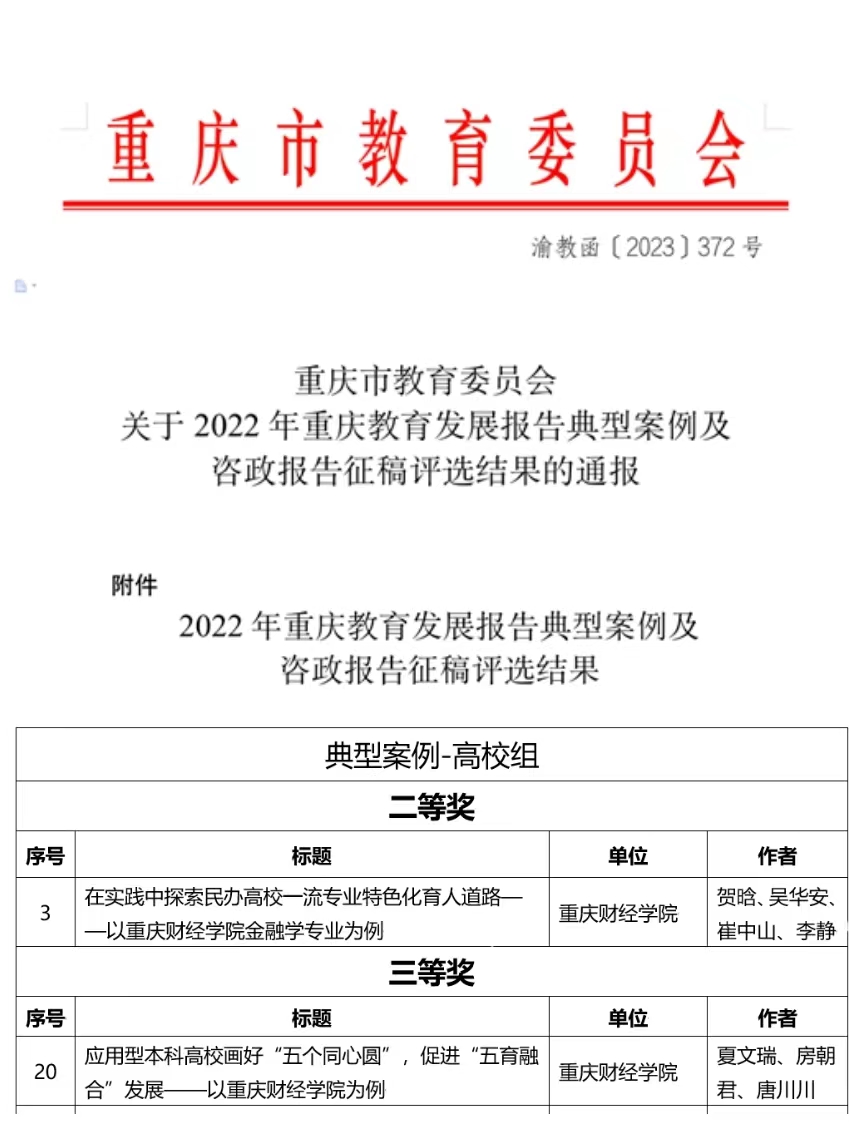 近日,重庆市教育委员会发布《重庆市教育委员会关于2022年重庆教育发展报告典型案例及咨政报告征稿评选结果的通报》(渝教函〔2023〕372号)。我校在2022年重庆教育发展报告典型案例及咨政报告征稿评选中荣获二等奖1项,三等奖1项。据重庆市教育委员会通报,此次征稿共收到稿件487篇,经专家评审,评选出优秀作品219篇,获奖作品将择优收录入《2022年重庆教育发展报告》。我校也将继续围绕党委政府关切、社会关注、人民群众关心的教育重点、热点和难点问题,认真总结,深入研究,持续提供优秀的教育教学典型案例和具有决策参考价值的教育咨政报告。