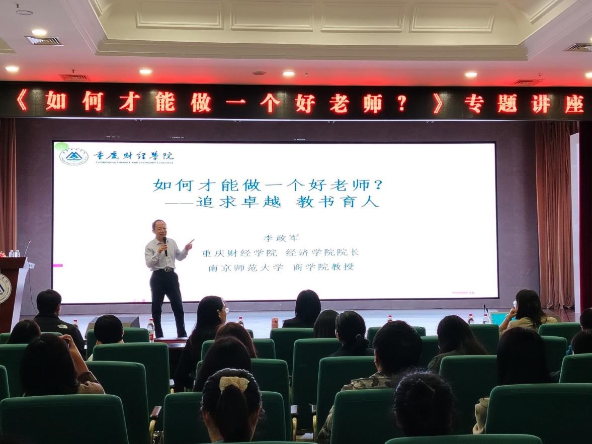为进一步了解高校教师的职业特点和要求,明确教师的角色定位,树立正确的教育理念,掌握丰富的教学方法,10月12日下午,我校教务处(教师教学发展中心)联合经济学院在教学楼学术报告厅组织开展“如何才能做一个好老师?”专题讲座。本次讲座特别邀请我校经济学院院长、经济学教学团队首席教授李政军担任主讲人,由教务处副处长李梨主持,各二级学院教学负责人、专职教师代表180余人参加。