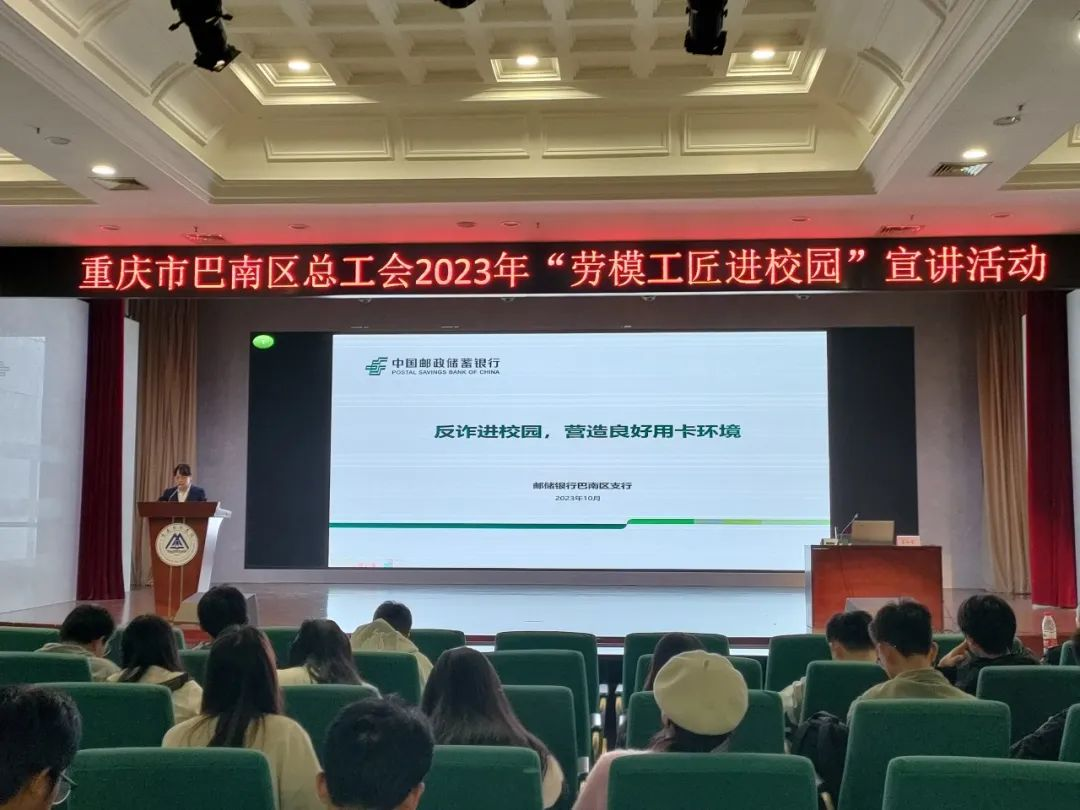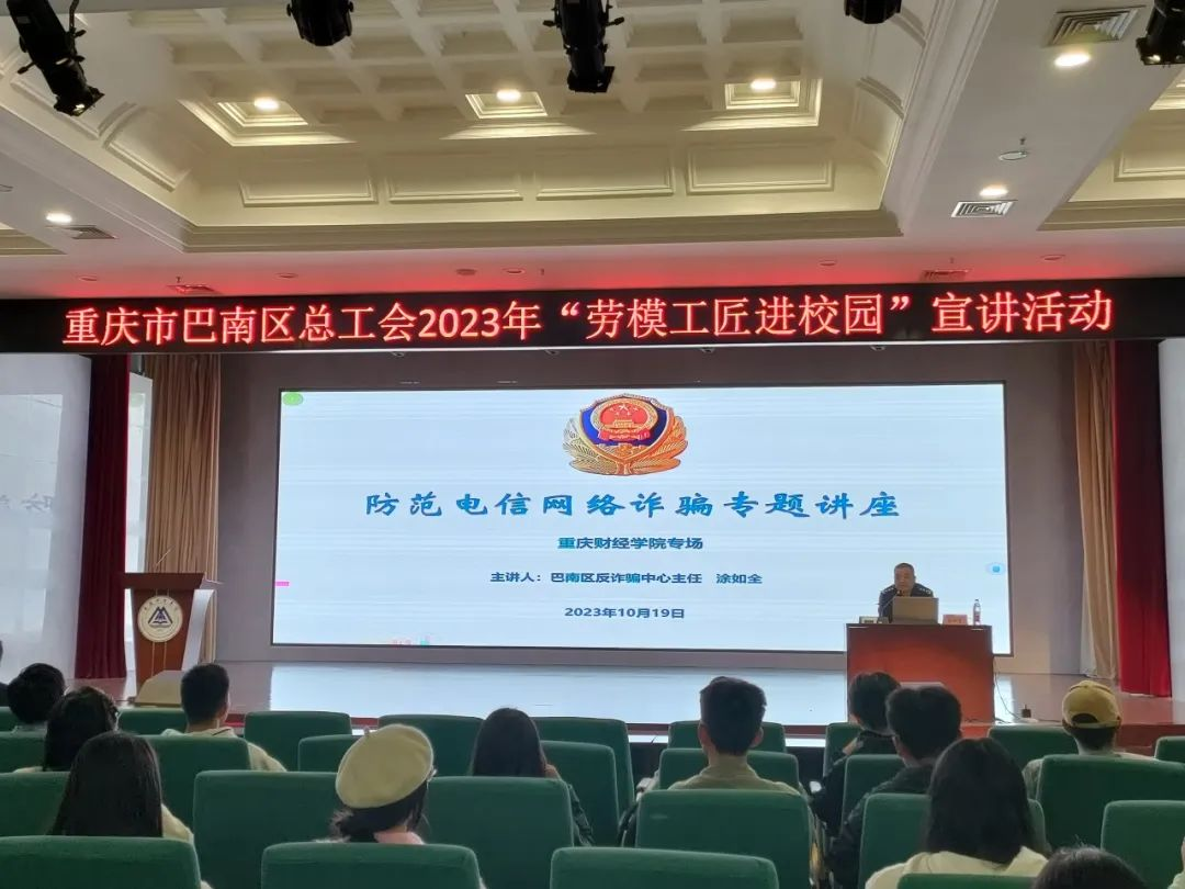 为进一步增强大学生识骗防骗意识和能力,10月19日下午16点整,我校在学术报告厅成功举办“‘劳模工匠进校园’宣讲活动之防范电信网络诈骗”专题讲座。此次讲座以“反诈”为主题展开,由巴南区反诈骗中心主任涂如全担任主讲人,团委书记夏文瑞担任主持人。学校保卫处处长欧英前、巴南区总工会相关负责人尹泽辉、巴南区公安分局秦莲警官 、巴南区邮储银行反诈宣传代表、相关职能部门负责人以及学生代表参加此次活动。