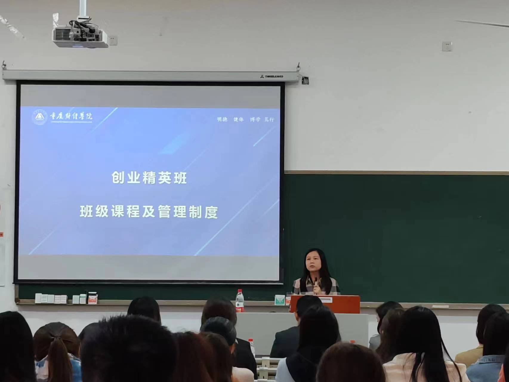 接着,教育商学院双创中心主任莫紫霄介绍了创业精英班课程安排及班级管理制度。她从班级课程教学内容、授课师资力量、班级日常管理要求、学员综合考核制度等方面进行讲解,对“专家老师-班主任-班长-组长”综合评估层级管理制度作出说明,并呼吁大家一起参与到班级共建,共同营造良好学习氛围。