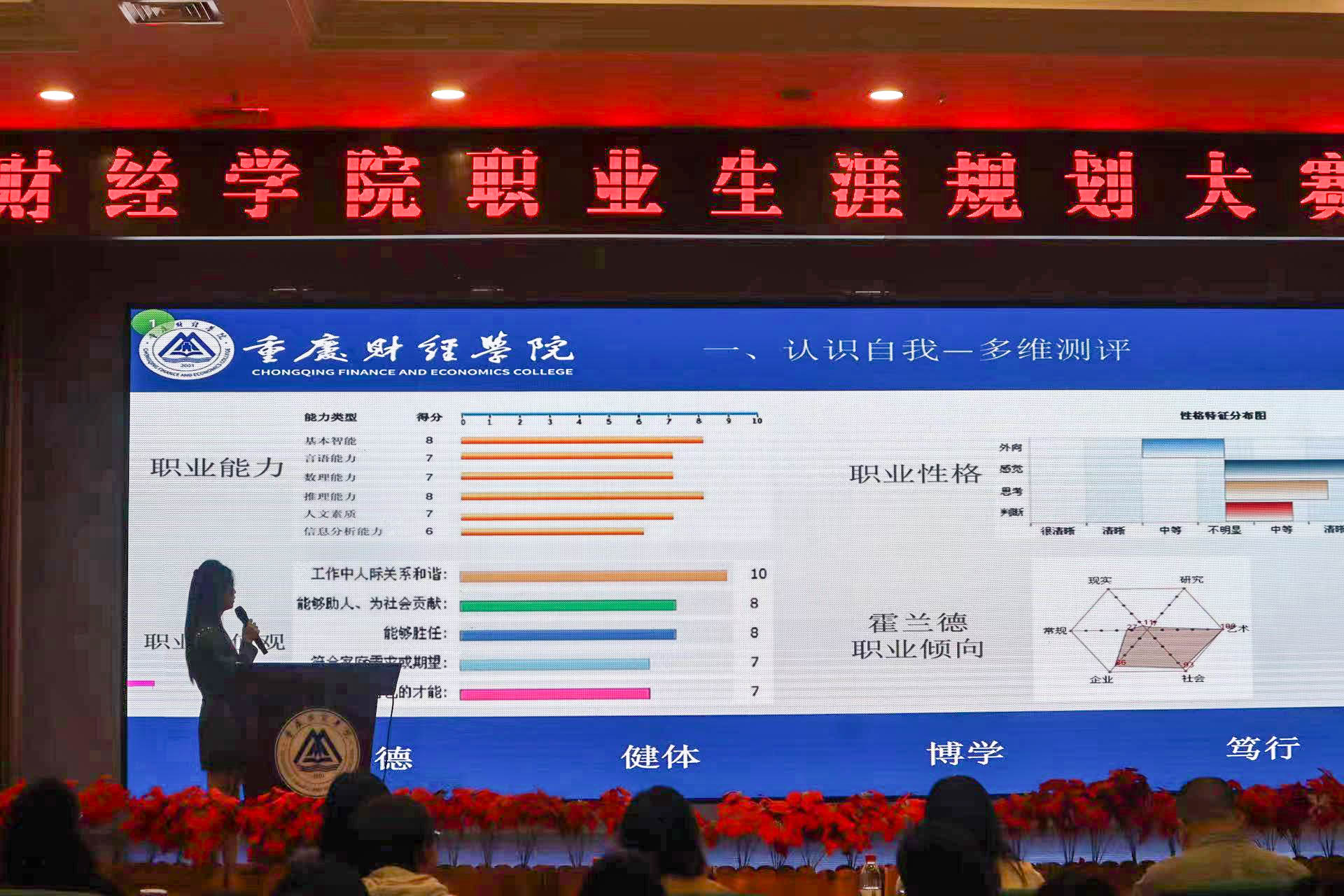 在经历前期院内初赛选拔后,共有9名同学来到决赛现场。各位选手结合职业测评报告,对自己职业生涯发展进行限时3分钟的路演。评委根据选手路演表现,结合赛前提交的纸质职业生涯规划书、现场提问、路演情况等进行评分。比赛过程中,选手们针对各自不同的目标职业,如中国特色青年温度的乡村振兴新媒人、银行客户经理、研究型公务员等,分享了他们如何不断挖掘自身潜能,积极参与相关活动的经历,并将自身的优劣势与社会环境相结合进行深度剖析。