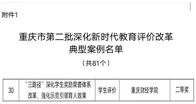 近日,中共重庆市委教育工作领导小组秘书组印发《关于公布第一批重庆市深化新时代教育评价改革典型案例的通知》(渝委教秘发〔2023〕7号),市委教育工作领导小组成员单位及各区县、高校、有关单位共提交案例322个,经材料审核、专家评审、结果公示等程序,共遴选出重庆市第二批深化新时代教育评教改革典型案例81个,其中特等奖10个,一等奖15个,二等奖26个,三等奖30个。我校案例成果《“三路径”深化学生奖励荣誉体系改革,强化示范引领育人效果》荣获市级“二等奖”。