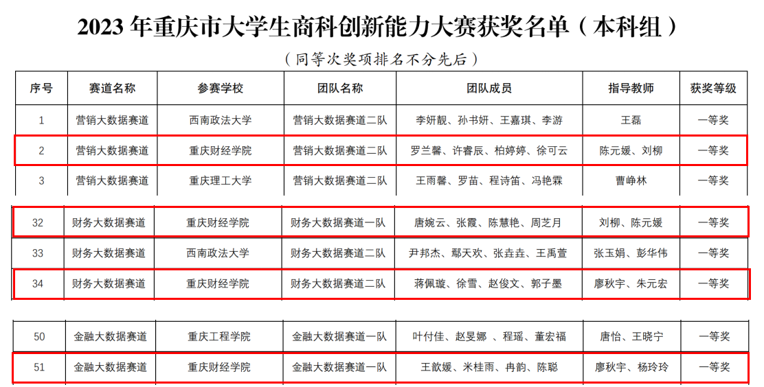 11月4日,由重庆市教育委员会主办,新道科技股份有限公司提供技术支持的2023年重庆市大学生商科创新能力大赛隆重举行。我校会计学院4支代表队分别参加了财务大数据赛道、营销大数据赛道、金融大数据赛道的比赛,均荣获一等奖。