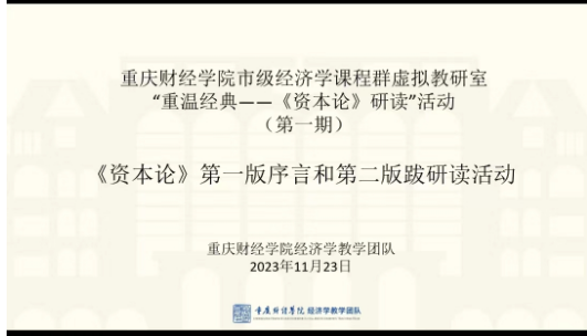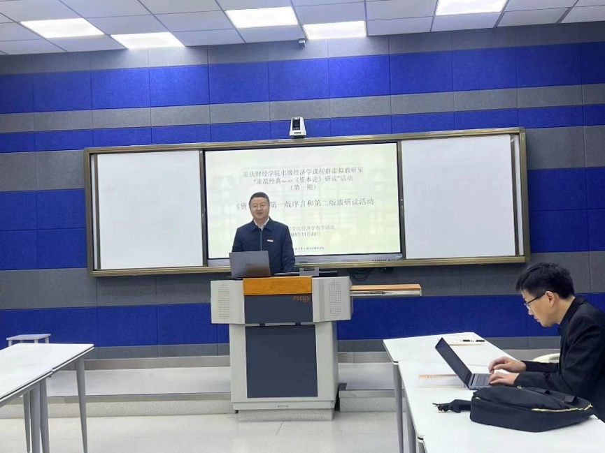 11月23日上午,我校市级经济学课程群虚拟教研室在教学楼1220智慧教室成功举办第一期“重读经典—《资本论》研读”活动。校长吴华安教授出席活动并讲话, 经济学院院长李政军教授主持了整场活动,我校经济学教学团队成员与来自华侨大学、延边大学、西华大学、四川外国语大学和江苏第二师范学院等学校的20位教师一起,通过线下线上相结合的形式参加活动。