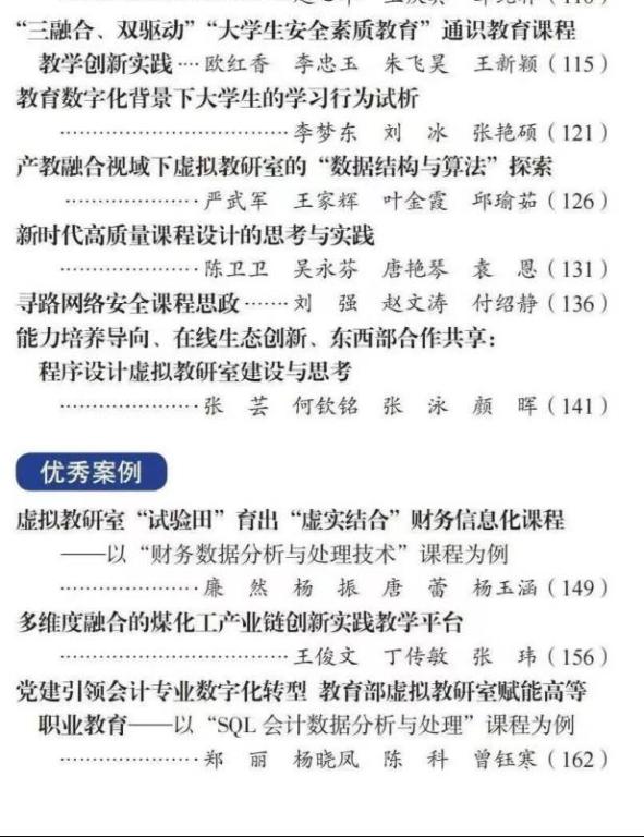 11月30日,由教育部指导、教育部虚拟教研室建设专家组主办的《高校智慧教研》内刊公布第4期录用名单,我校财富管理学院廉然、杨振、唐蕾、杨玉涵撰写的《虚拟教研室“试验田”育出“虚实结合”财务信息化课程》入选《高校智慧教研》内刊优秀案例。