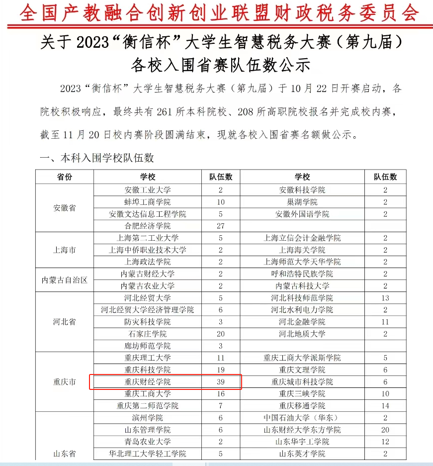 2023年“衡信杯”大学生智慧税务大赛(第九届)于10月22日开赛启动,本次“衡信杯”大学智慧税务大赛由校赛、省赛和决赛三轮组成。全国各院校积极响应,最终共有261所本科院校、208 所高职院校,20786名学生报名并完成校内赛,截至11月20日,校内赛阶段圆满结束,我校获得了39队的晋级名额,为重庆市历年晋级队伍最多的高校。