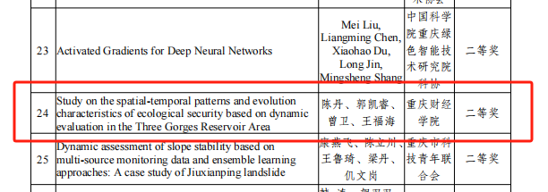11月5日,重庆市科学技术协会公布了《关于2023川渝科学技术大会优秀论文、年度川渝最具影响力学术活动、川渝一流学会、川渝一流科技期刊获得者的通报》。我校教师陈丹为第一通讯作者撰写的《Study on the spatial-temporal patterns and evolution characteristics of ecological security based on dynamic evaluation in the Three Gorges Reservoir Area》(基于动态评价的三峡库区生态安全时空格局及演变特征研究)获二等奖。