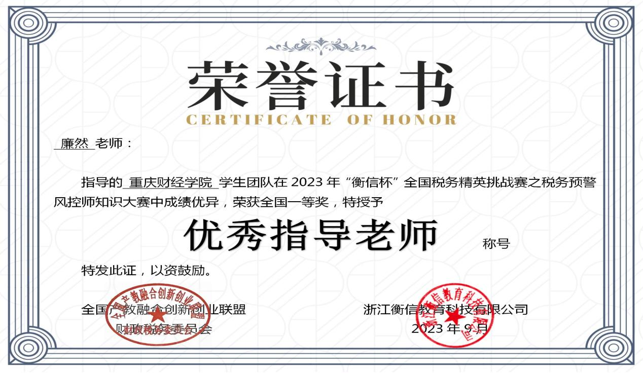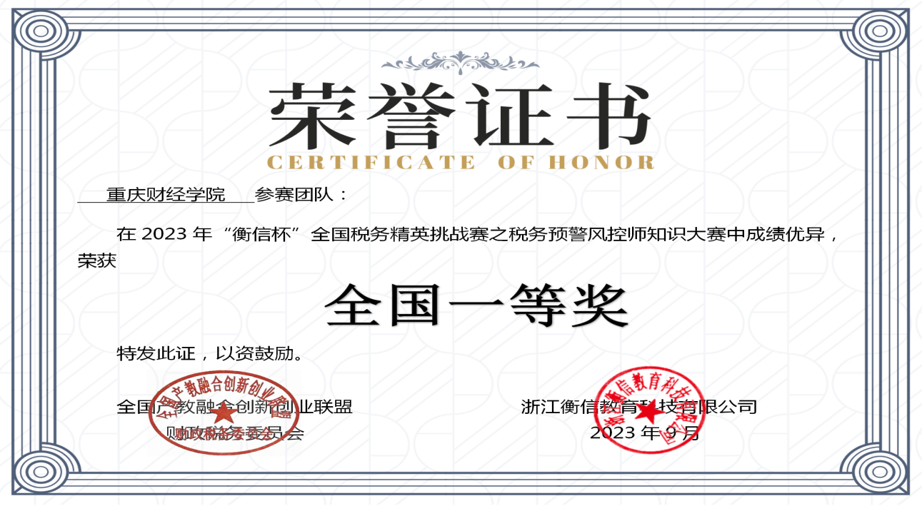 日前,由中国企业财务管理协会主办,全国产教融合创新创业联盟财政税务委员会和浙江衡信教育科技有限公司联合主办的2023年“衡信杯”全国税务精英挑战赛之税务预警风控师知识大赛(学生组)落下帷幕。我校荣获大赛团体全国一等奖,财富管理学院廉然老师荣获“优秀指导教师”奖。