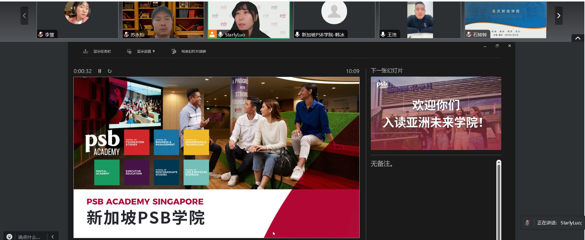 12月19日上午,我校与新加坡PSB学院云端相聚,开展国际合作与交流项目洽谈会。副校长崔中山、国际合作与交流处处长石转转、中新金融科技现代产业学院执行院长田东、PSB学院韩冰老师、西南区招生负责人罗丹吟老师等参加洽谈会。
