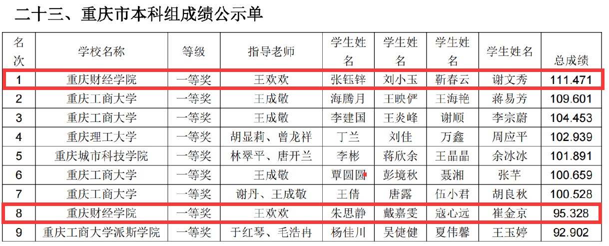 12月17日,2023年“衡信杯”智慧税务大赛重庆市赛顺利举办。本次大赛由全国产教融合创新创业联盟财政税务委员会主办,浙江衡信教育科技有限公司提供技术支持。重庆市本科组10所学校共106支队伍参赛,我校组织20支队伍参加比赛,其中会计学院3支,财富管理学院17支,获得重庆市一等奖2项(均为会计学院指导的团队),二等奖2项(均为财富管理学院指导的团队),三等奖7项(会计学院指导的1个团队和财富管理学院指导的6个团队)。张钰锌、刘小玉、谢文秀和靳春云团队的成绩在重庆市本科组106支队伍中排名第一,实现了本校在本比赛的突破,也极大的鼓励了以后更多的学生参与到本竞赛中。