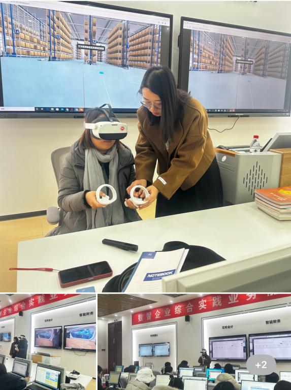AIE智境-数智商业综合实践课程由新道科技高级教学产品经理高伟老师主讲,选取了无人机制造经营的行业背景,基于虚拟仿真技术搭建从原料供应—生产制造—市场运营的仿真商业链条,将物流、金融、税务、政务、碳交易、数字化管理嵌入其中,打造全景商业环境。学员置身其中进行岗位分工、角色扮演、业务演练。培训中,为学员更好理解企业中的智能化流程,还专门让学员们使用VR眼镜沉浸式感受了财务数字化平台中的企业采购入库、领料出库、生产入库等不同流程场景。VR体验结束后参会学员们进行了深入的交流讨论。通过AIE智境-数智商业综合实践平台的学习,学员们提升了对数智商业的经营认知、数字化工具的使用能力、数据分析能力和数字化素养。