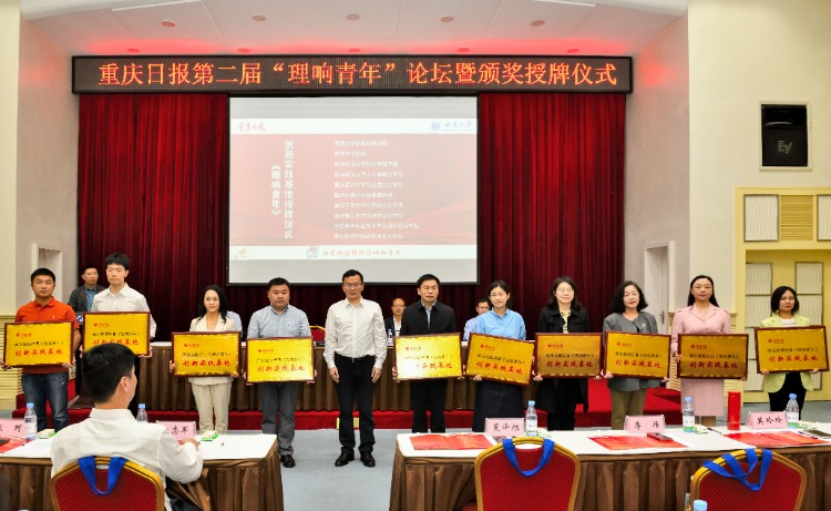4月28日上午,在西南大学举办的重庆日报第二届“理响青年”论坛暨颁奖授牌仪式上,重庆日报报业集团党委副书记、总编辑刘长发为入选首批“重庆日报理论视频栏目《理响青年》创新实践基地”的单位授牌,全市共10所高校获评,我校为唯一入选的民办院校。新媒体艺术学院传媒系王新宇主任参与单位授牌仪式并代表学院接受授牌