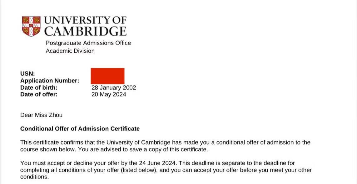 【喜报】热烈祝贺金融学院20CFA项目班周怡宁同学斩获剑桥大学offer!