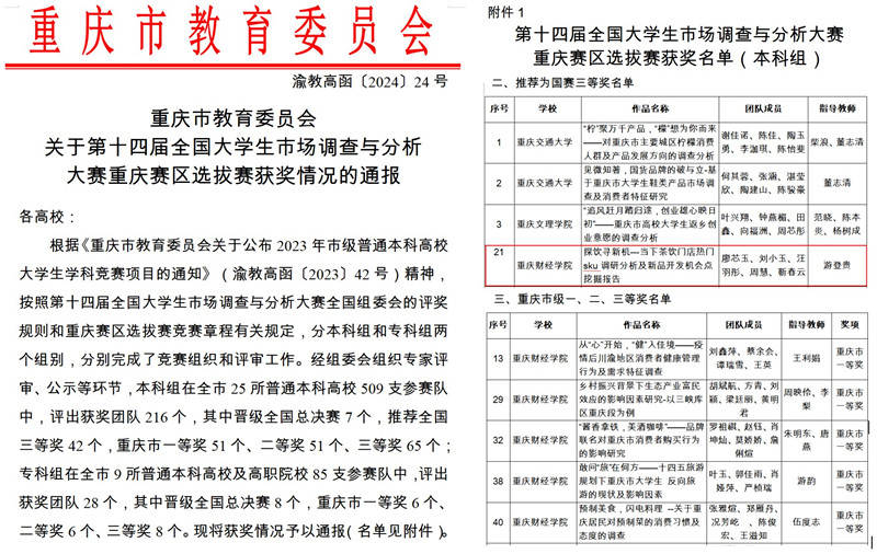 近日,由中国商业统计学会主办的“正大杯”第十四届全国大学生市场调查与分析大赛本科组重庆赛区选拔赛圆满落幕。在我校师生的共同努力之下,最终获得全国三等奖1项、重庆市级一等奖5项、市级二等奖5项和市级三等奖1项。