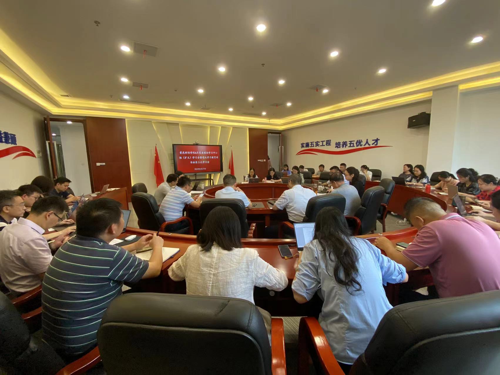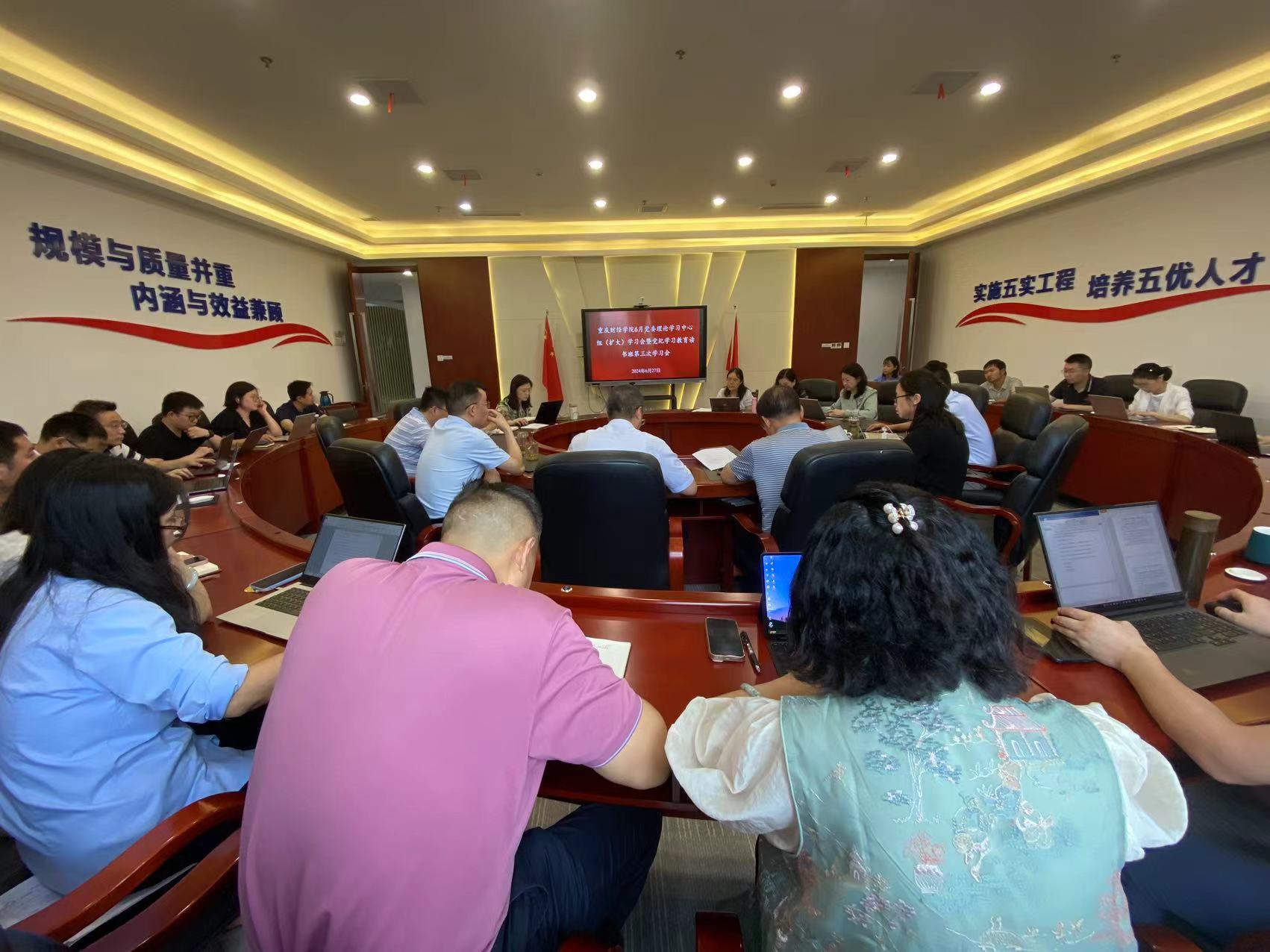 为深入学习贯彻习近平总书记在新时代推动西部大开发座谈会和视察重庆重要讲话重要指示精神,将“学纪、知纪、明纪、守纪”落实到学校发展的重大战略当中。6月27日,我校召开党委理论学习中心组(扩大)学习会暨党纪学习教育读书班第三次学习会,深入学习《中国共产党纪律处分条例》和重庆市委六届五次全会精神。校领导、党委委员、纪委委员,二级学院书记、院长以及职能部门负责人参加会议,党委书记张毅同志主持会议。 会上,房朝君同志领学《中国共产党纪律处分条例》之廉洁纪律,李春雷同志领学《中国共产党纪律处分条例》之群众纪律,崔中山同志领学《中国共产党纪律处分条例》之工作纪律,张立同志领学《中国共产党纪律处分条例》之生活纪律,倪倩茜同志领学市委六届五次全会精神,并结合学校发展实际分享学习心得,滕学英、曾真、陈晴等同志围绕学习内容结合工作实际作交流研讨。 张毅同志强调,加强纪律建设是全面从严治党的治本之策。学习《中国共产党纪律处分条例》不仅是当前的任务,也是我们日常工作和生活中需要常常翻阅、时时学习、久久反思的终身任务。一是要善复盘、找差距、补短板,全面总结求真务实。要着眼于实现纪律建设的与时俱进,全面推进从严治党向纵深发展,促进学校建设法制化、规范化、标准化建设。二是要知敬畏、正身心、树防线,戒尺高悬自省自警。履职尽责、规范工作,担当作为、干事创业,时刻警醒自己,筑牢思想堤坝,抵御腐蚀,清正廉洁。三是要明方向、正风气、强定力,担当作为实干笃行。全局谋划、系统部署,勇于革新、突破发展,推动学校制定符合新时代财经类高校融入现代化长远发展的机制体制。四是要守初心、担使命、建新功,与时俱进干事创业。全力推进教育思想大讨论圆满收官、全力推进合格评估指标如期完成,全力推进新质生产力落地实效。