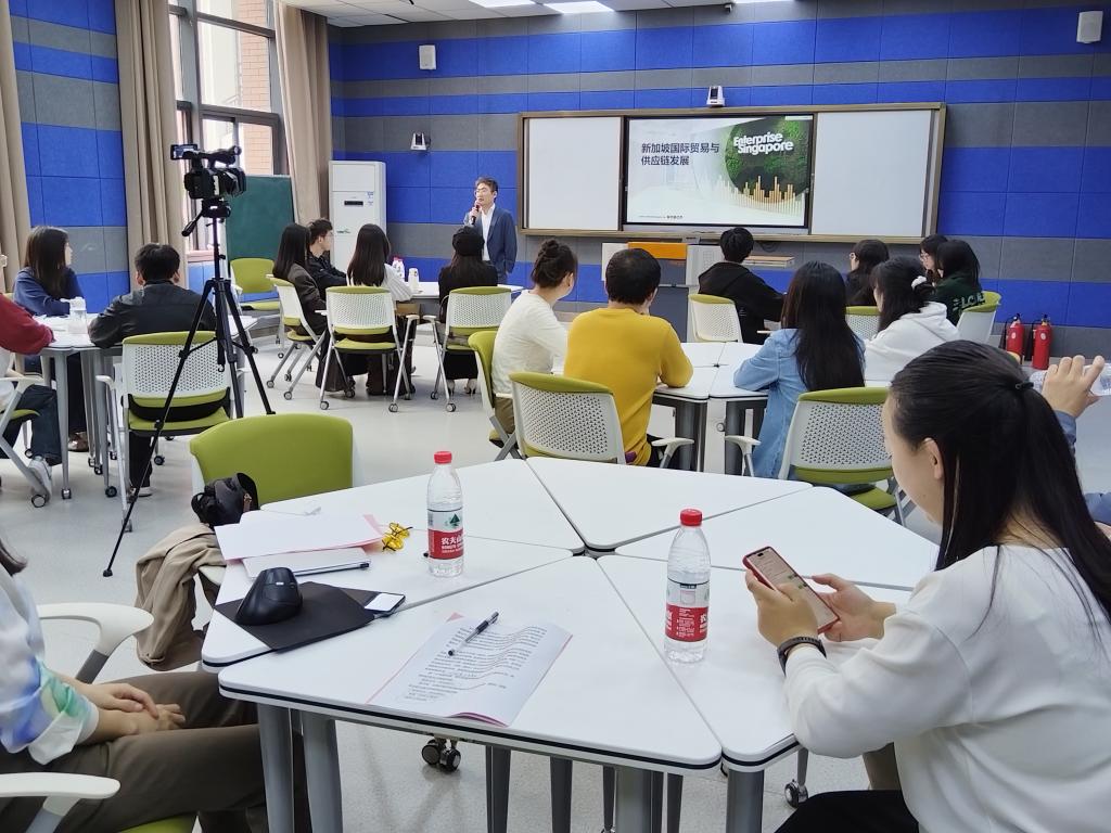 10月24日,我校中新国际贸易与供应链产业学院(下称产业学院)第二期卓越人才班主题讲座在教学楼1220智慧教室顺利举行。讲座由新加坡企业发展局(下称新加坡企发局)中国司华西区商务经理胡晨与重庆市商务委中新物流航空处副处长郑弦主讲。新加坡企发局中国区副司长叶栢安,中新互联互通(重庆)物流发展有限公司企业导师代表,我校校长吴华安、物流工程学院院长刘岱、副院长陈郑霖,卓越人才班导师团队和全体学员参加讲座。
