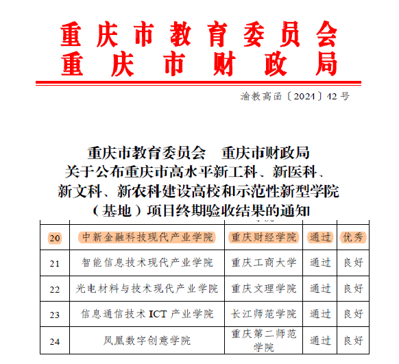 近日,重庆市教育委员会、重庆市财政局公布了市级高水平新工科、新医科、新文科、新农科建设高校和示范性新型学院(基地)项目终期验收结果。我校中新金融科技市级示范性现代产业学院建设项目(以下简称本项目)以“优秀”等次通过终期验收。