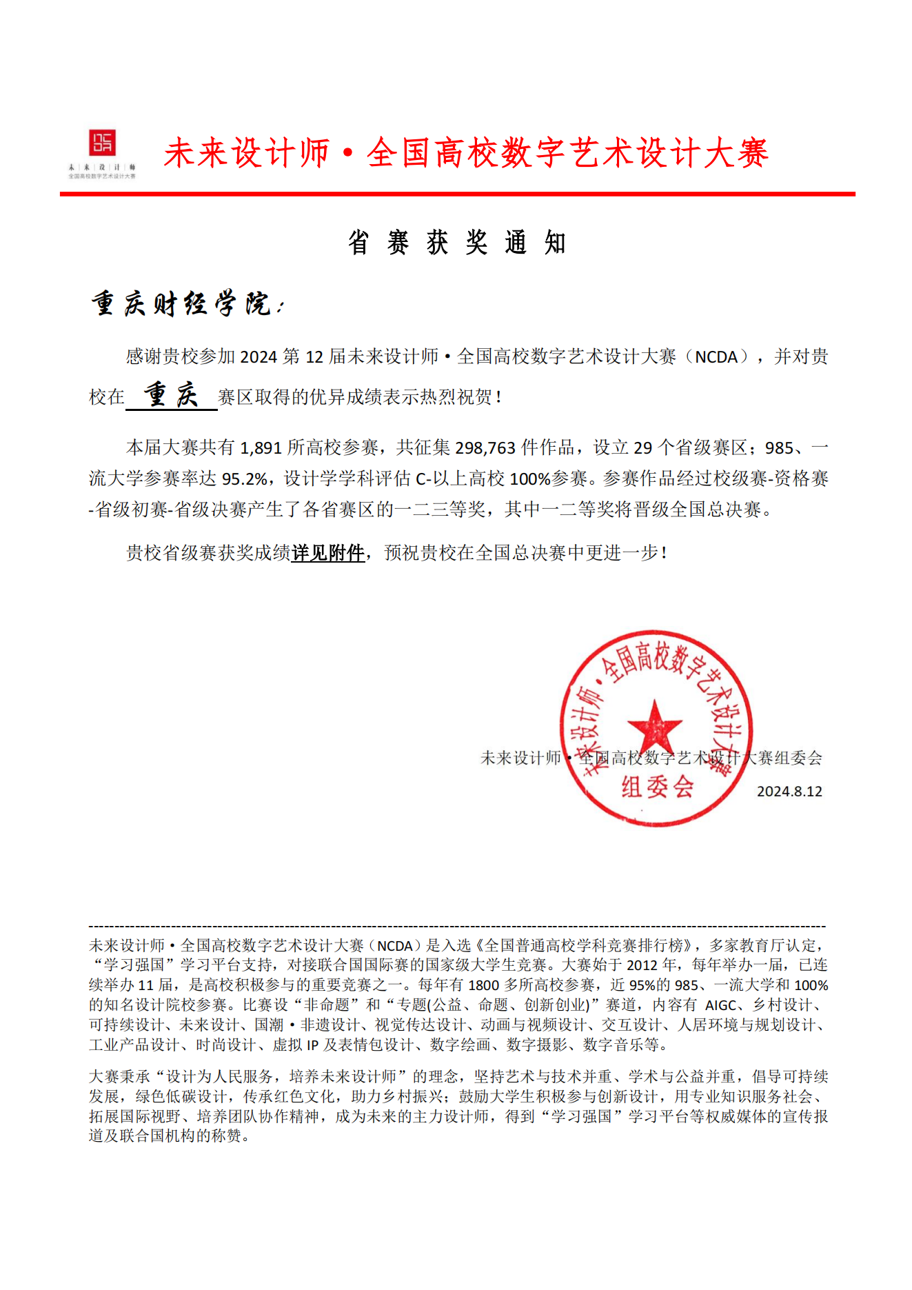 未来设计师·全国高校数字艺术设计大赛(NCDA)是入选《全国普通高校学科竞赛排行榜》,多家教育厅认定,“学习强国”学习平台支持,对接联合国国际赛的国家级大学生竞赛。大赛始于2012年,每年举办一届,已连续举办12届,是高校积极参与的重要竞赛之一。每年有1800多所高校参赛,95%的985、一流大学和100%的知名美院参赛。竞赛采用“校赛-省赛-国赛”三级赛制,设立“非命题”和“专题(含命题、公益)“和”创新创业“三个赛道,内容有AIGC、乡村设计、可持续设计、未来设计、国潮·非遗设计、视觉传达设计、动画与视频设计、交互设计、人居环境与规划设计、工业产品设计、时尚设计、虚拟IP及表情包设计、数字绘画及写生、数字摄影、数字音乐等。