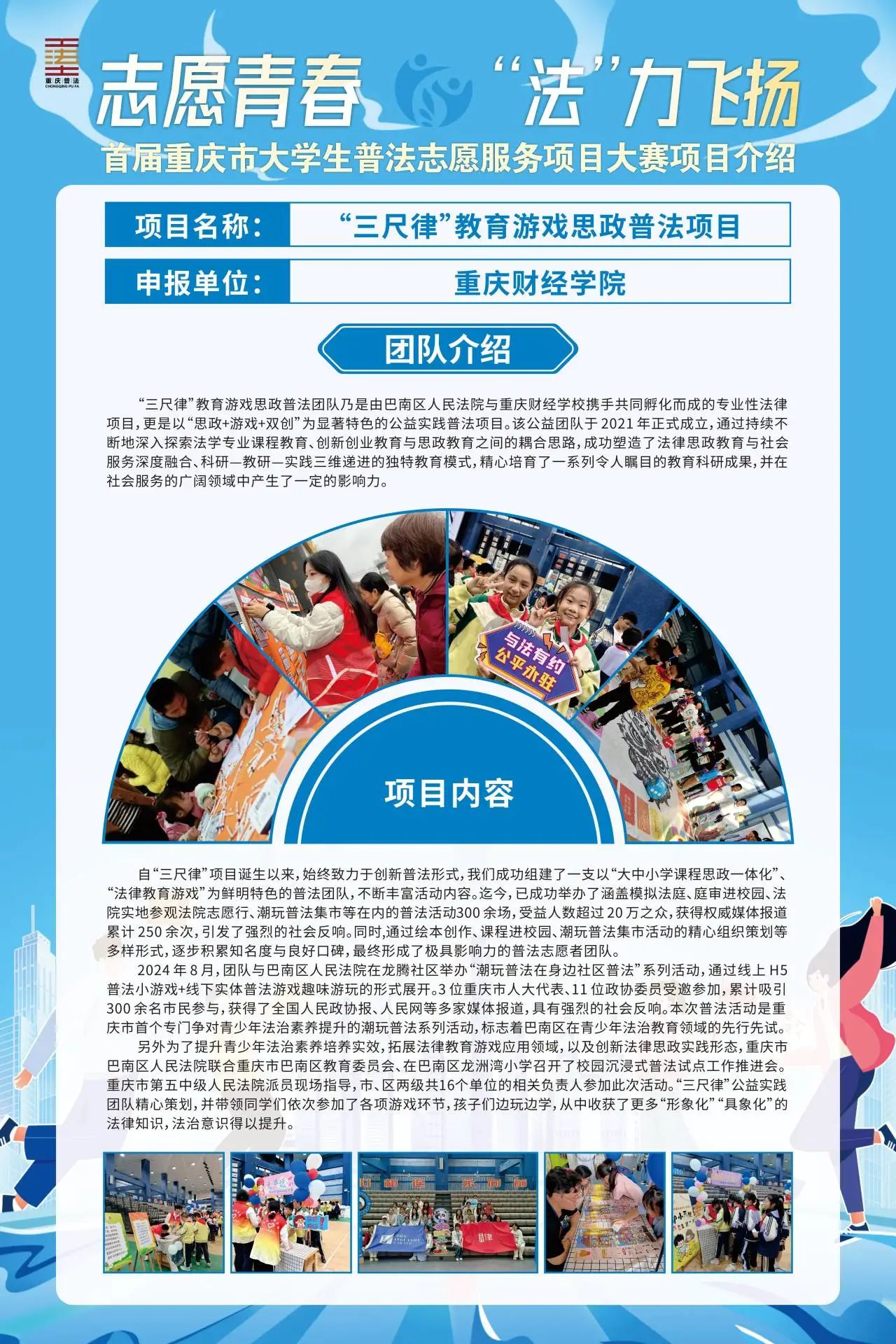 11月21日,由重庆市司法局、市教委、团市委、市普法办主办的首届重庆市大学生普法志愿服务项目大赛在重庆工商职业学院圆满收官。我校“三尺律”教育游戏思政普法团队(以下简称“三尺律”普法团队)在与西南政法大学、重庆大学、西南大学等多所高校的激烈角逐中脱颖而出,荣获 “最佳团队奖”,并以第六名的成绩斩获铜奖。