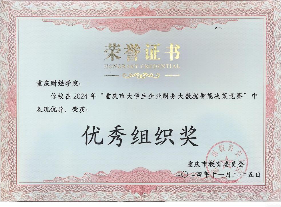 日,由重庆市教育委员会主办,重庆师范大学承办,教育部会计信息化课程虚拟教研室、金蝶精一信息科技服务有限公司协办的“2024年重庆市大学生企业财务大数据智能决策竞赛”圆满落幕。本次大赛吸引重庆大学、重庆师范大学、重庆理工大学、重庆电子工程职业学院、重庆财经职业学院等32所高校82支代表队参赛,经过激烈角逐,我校会计学院廉然和陈凤老师指导的刘宁铃、付晓燕、唐小芳组成的队表现出色,荣获省赛等奖我校也荣获优秀组织奖,这是我校首次在此类大赛中获奖。