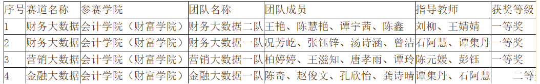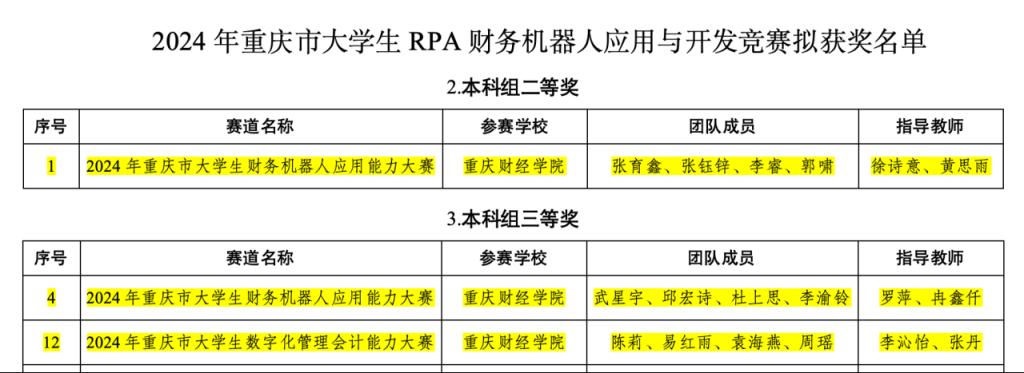 ★2024年11月,在2024年重庆市大学生 RPA 财务机器人应用与开发竞赛中,徐诗意老师、黄思雨老师指导的学生团队(张育鑫、张钰锌、李睿、郭啸)获得二等奖;罗萍老师、冉鑫仟老师指导的学生团队(武星宇、邱宏诗、杜上思、李渝铃)获得三等奖;李沁怡老师、张丹老师指导的学生团队(陈莉、易红雨、袁海燕、周瑶)获得三等奖。