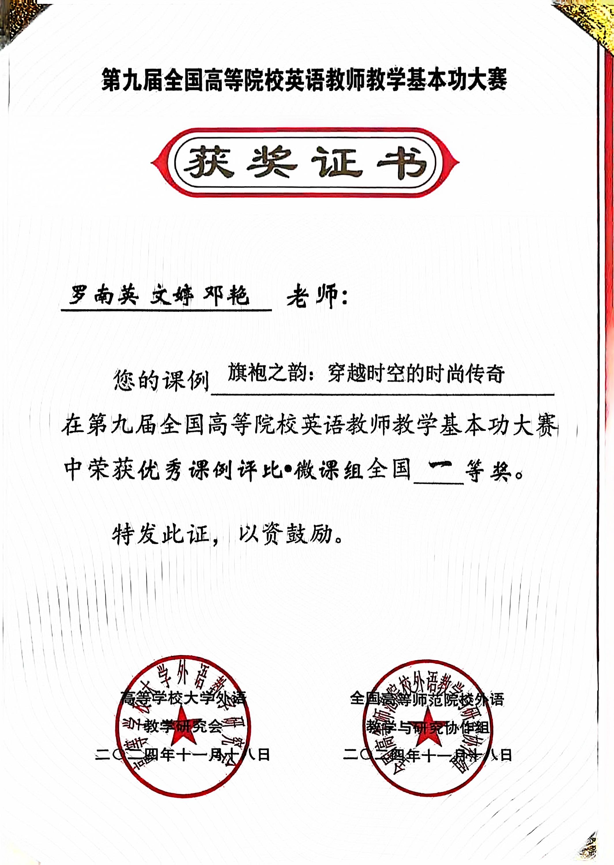 1118日,第九届全国高等院校英语教师教学基本功大赛落下帷幕。我校经过积极备赛,罗南英、文婷、邓艳团队携课例“旗袍之韵:穿越时空的时尚传奇”荣获优秀课例评比-微课组全国一等奖,黄兰荣获优秀指导教师奖。