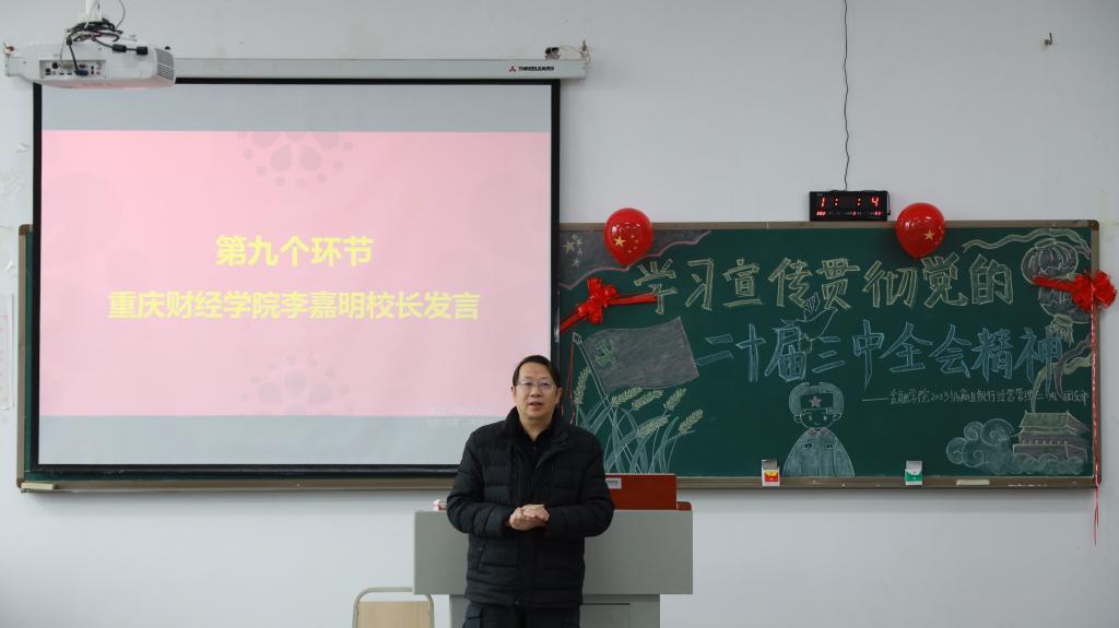 为深入学习贯彻党的二十届三中全会精神,引导广大青年学生深刻领会全会的重大意义和精神实质,切实把思想和行动统一到党中央决策部署上来。12月11日,学校副校长李嘉明深入金融学院2023级商业银行经营管理二班团支部指导开展主题为“学习贯彻党的二十届三中全会精神”的团日活动。