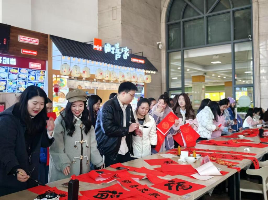上午11时,活动正式拉开帷幕。书法爱好者们现场挥毫泼墨,为同学们送上了一幅幅寓意吉祥的春联。这些春联不仅展示了书法艺术的魅力,更传递了新年的美好祝愿。同时,有兴趣的同学也积极参与即兴创作,用笔墨书写自己的新年心愿,为活动增添了一抹浓厚的文化色彩。