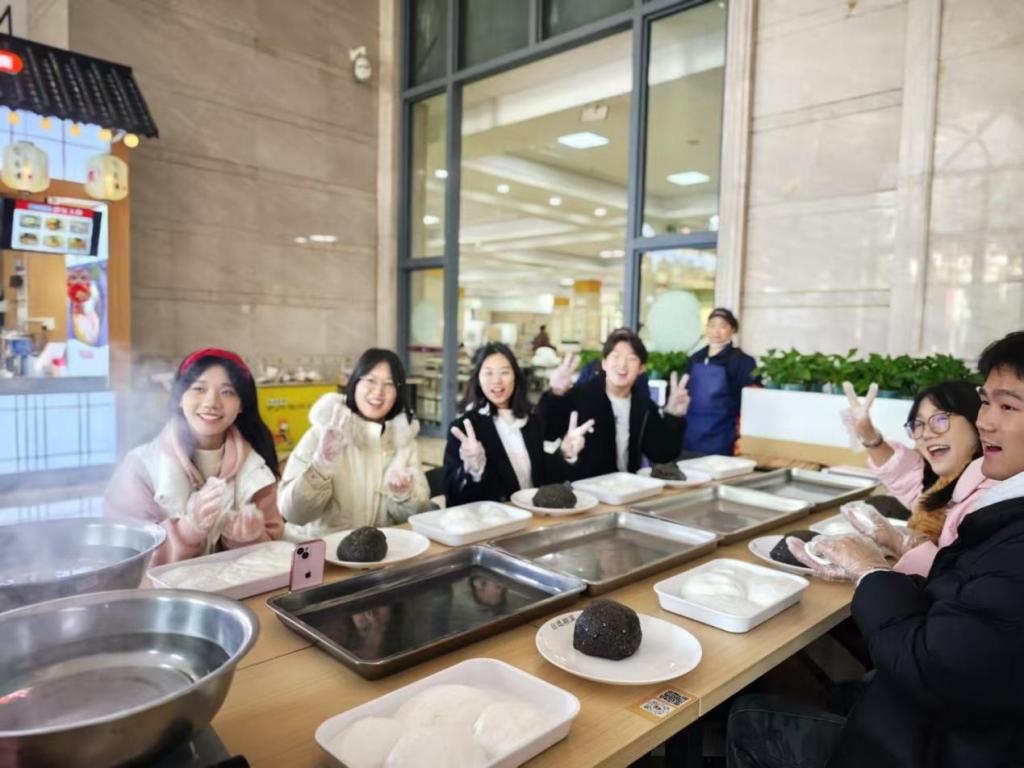 与此同时,另一项传统活动——包汤圆也在如火如荼地进行中。后勤精心准备了汤圆DIY食材,同学们围坐一堂,亲手制作汤圆,寓意新的一年“圆圆满满”,校园生活有点甜。在欢声笑语中,一颗颗圆润的汤圆逐渐成形,汤圆现包现煮,同学们吃到了自己包的汤圆,进一步感受到了节日的温馨与甜蜜。