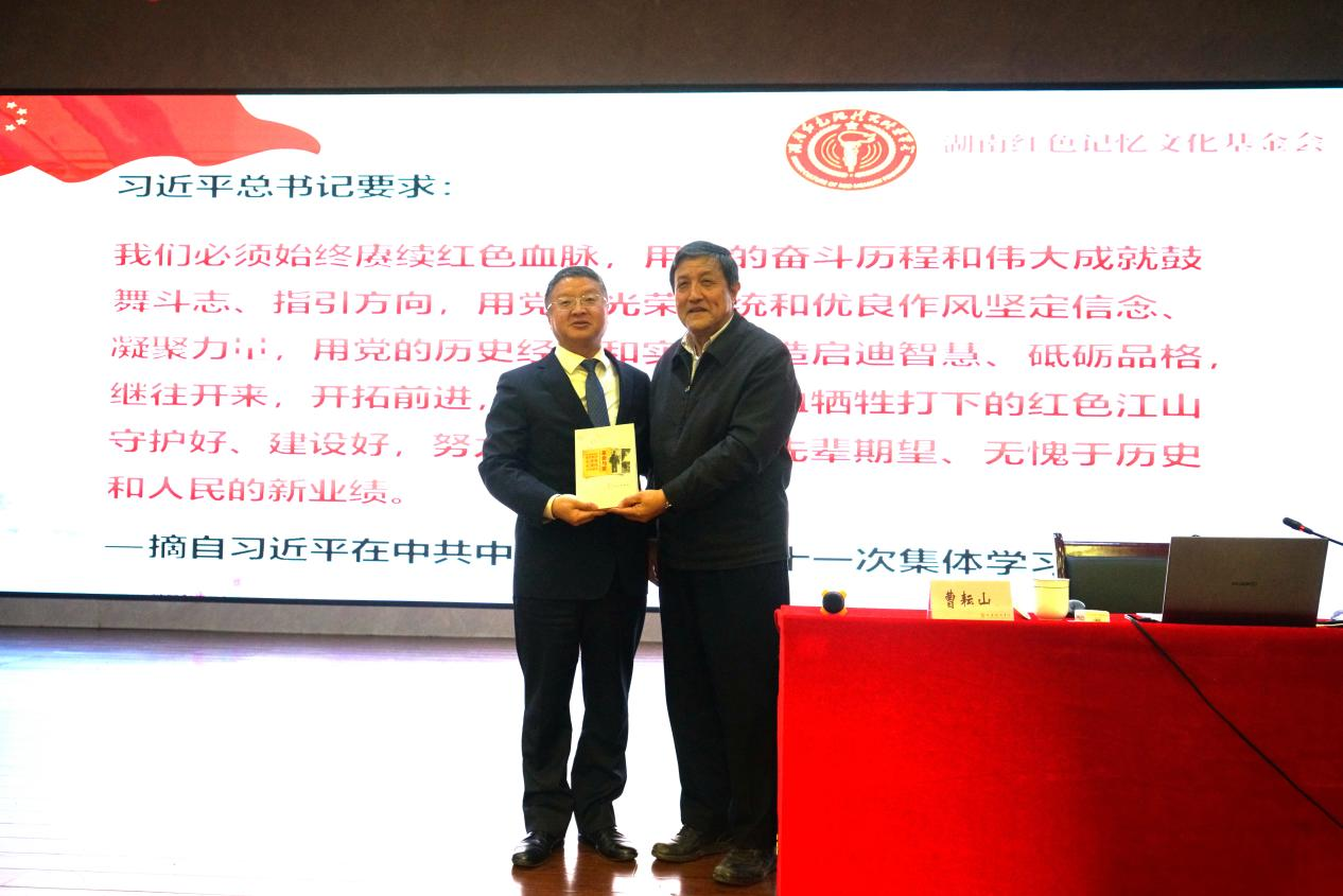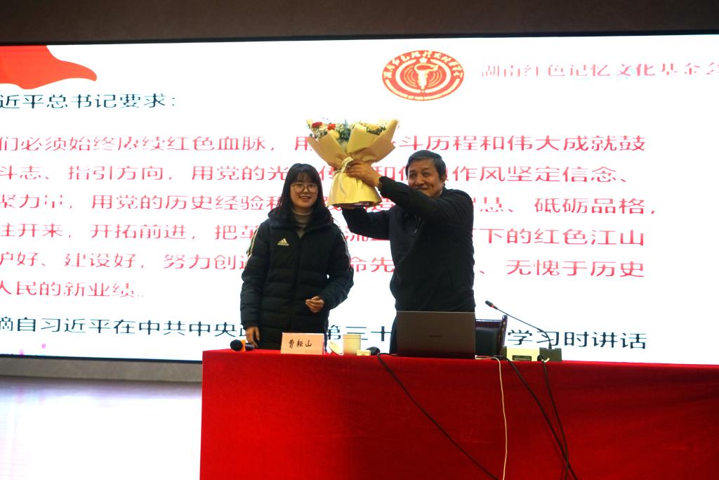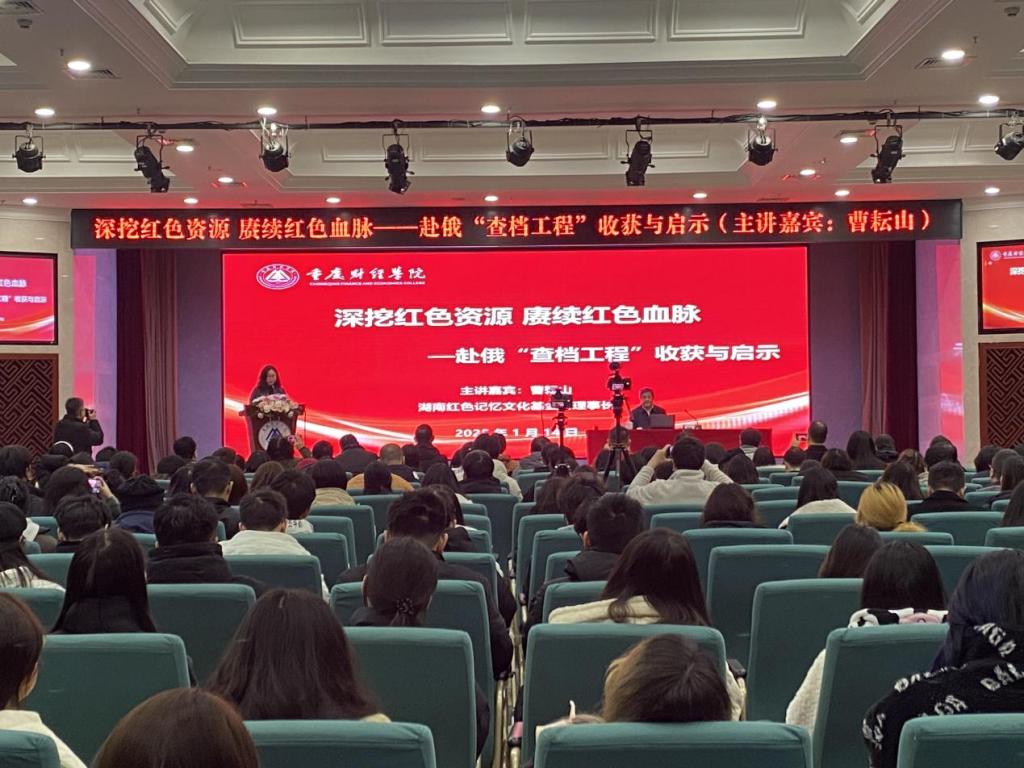 1月14日,我校举行“宣讲革命故事、传播红色文化、传承红色基因”主题报告活动。毛泽民烈士外孙、湖南红色记忆文化基金会理事长曹耘山先生应邀到校作了主题为“深挖红色资源 赓续红色血脉——赴俄‘查档工程’收获与启示”的专题讲座。