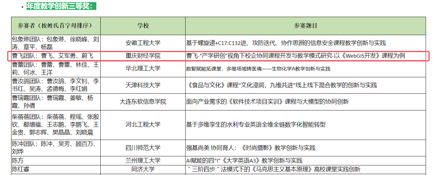 近日,第十届西浦全国大学教学创新大赛获奖名单揭晓,我校讯飞人工智能学院空间信息与数字技术教研室主任曹飞领衔的教学团队凭借《“产学研创”视角下校企协同课程开发与教学模式研究——以〈WebGIS开发〉课程为例》项目,斩获全国三等奖,实现学院在全国性教学比赛中奖项“零突破”。