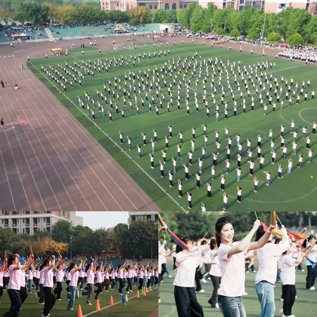 随后,600名学生联袂献上以“承古拓新 智慧未来”为主题的大型团体操表演。其中,序章“智慧启航”,他们手持彩扇,通过队形变换展现学校发展蓝图;第一章“承古朔魂”,武术与柔力球表演刚柔并济, 彰显中华文化的深厚底蕴;第二章“融汇新风”,匹克球与体育舞蹈活力四射,迸发出青春活力;第三章“竞速超越”,足球与健美操动感十足,诠释了体育竞技的激情与魅力;第四章“跃动未来”,啦啦操与集体舞表演中,呈现出“强国、健体、数字、创新”造型,既展现了重财学子昂扬向上的精神风貌,更寄托了全校师生对美好未来的无限憧憬。整场表演气势恢宏、创意十足,赢得了阵阵喝彩。