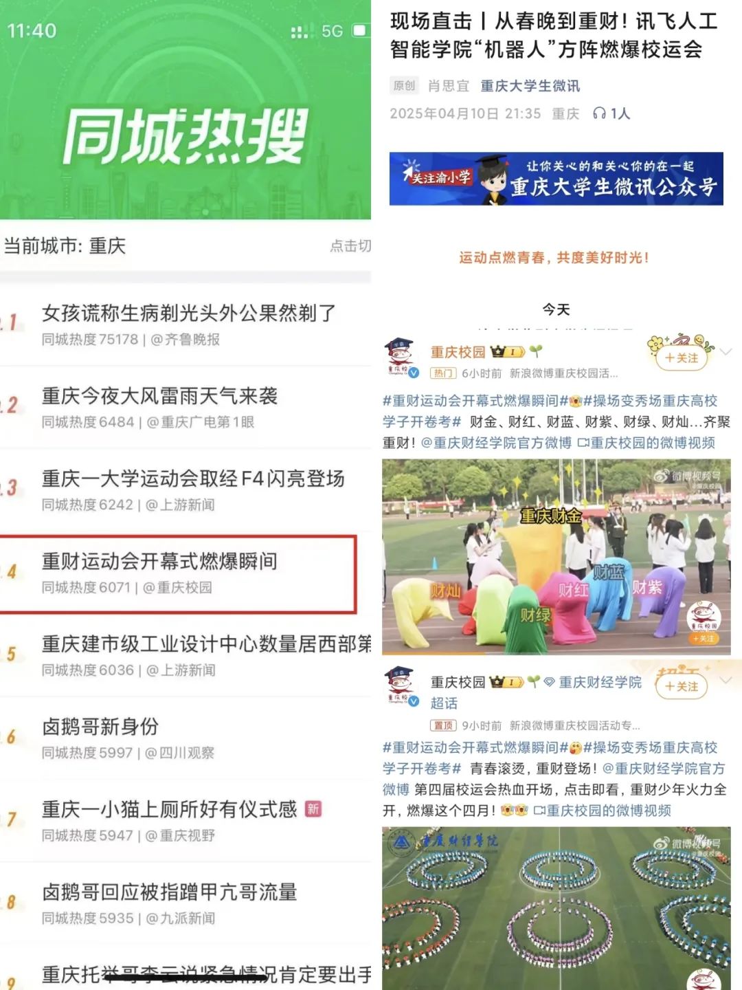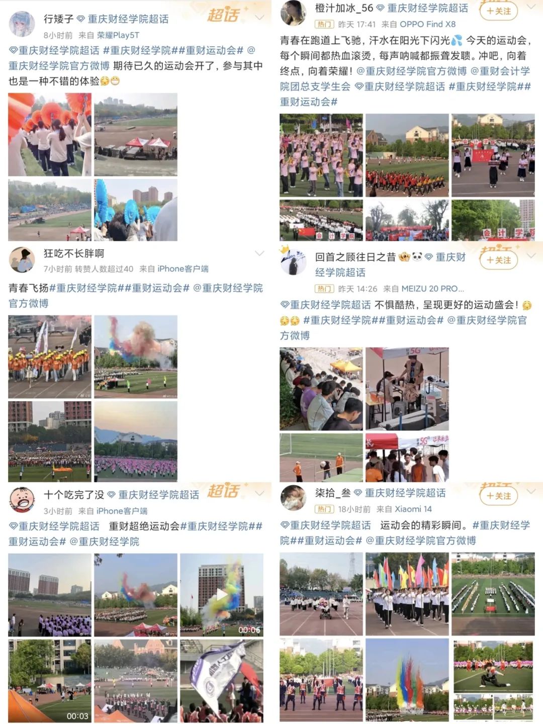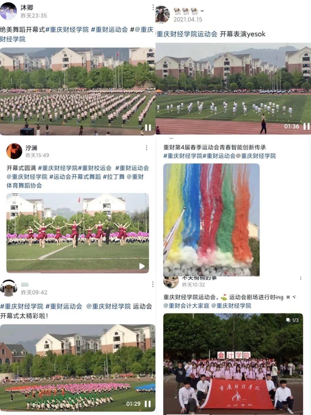 在本次运动会期间,重财师生广泛通过微博抖音积极分享运动会的精彩瞬间,“重财开幕式燃爆瞬间”在微博同城热搜中最高位列第四名,运动会开幕式视频、特色表演被重庆校园转发,特色节目被重庆大学生微讯发布。