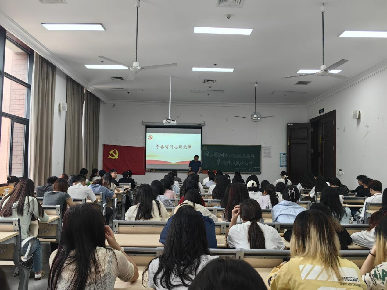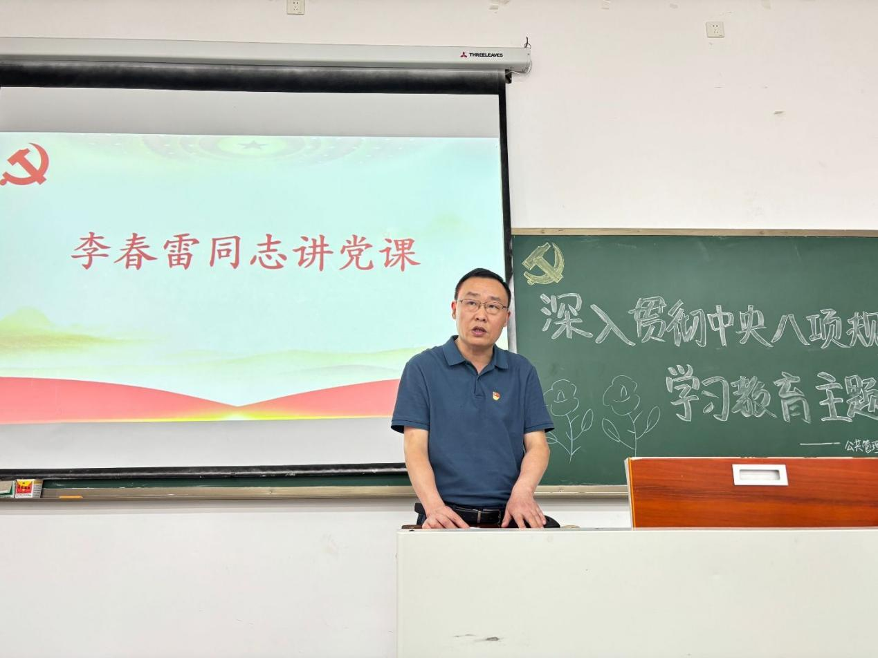 为深入贯彻中央八项规定精神,持续加强支部党员纪律意识,扎实推进作风建设,5月14日,校党委委员、副校长李春雷同志在教学楼1406教室为公共管理学院师生党员等作了主题为“严守中央八项规定,争做新时代合格党员”的专题党课。学院党政领导班子成员、全体学生党员及入党积极分子等200余人参加学习。