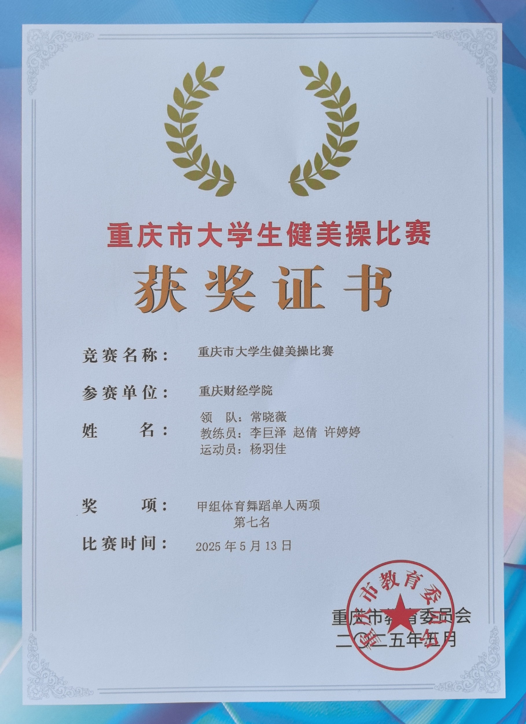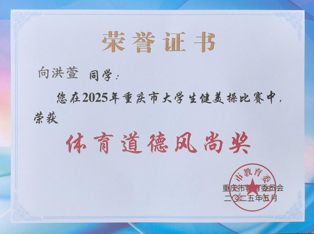 近日,由重庆市教育委员会主办的2025年重庆市大学生健美操比赛在四川外国语大学举行。我校体育舞蹈队参赛选手,在首次参加体育舞蹈甲组比赛中,取得优异成绩。