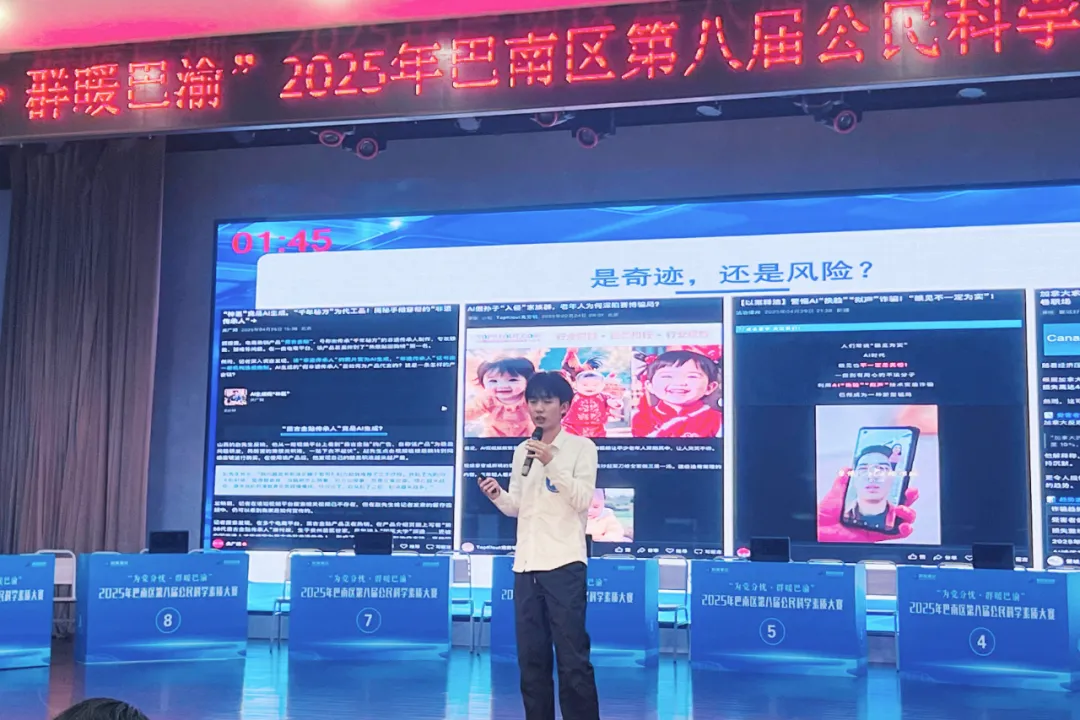 为深入贯彻落实《中华人民共和国科学技术普及法》和《重庆市公民科学素质行动规划纲要实施方案(2021-2025)》要求,在全社会营造热爱科学、崇尚创新的浓厚氛围,推动西部科普中心建设,日前,由区科协、区科技局、区农业农村委、区总工会、团区委、区妇联主办,我校承办,人工智能科普中心、讯飞人工智能学院协办的2025年巴南区第八届公民科学素质大赛在学术报告厅落下帷幕。