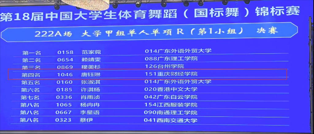 作为全国高校体育舞蹈的顶级赛事,该比赛吸引了来自全国176所高校共计1700余名运动员参加。在为期4天的团体和单项激烈竞赛中,队员们团结协作、奋勇拼搏、斗志昂扬、沉着应战、积极进取,纷纷闯入半决赛和决赛圈。其中唐钰琳同学获得大学甲组单人单项R第四名,邓慧同学获得大学甲组单人三项L第四名,这次是我校单人成绩的历史最好成绩,首次突破全国前五。