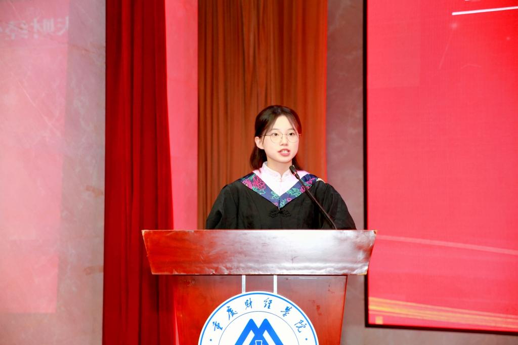 毕业生代表毛怡然发言,她深情表达了对学校培养的感激之情,并表示同学们将以“明德健体、博学笃行”校训为帆,奔赴新的征程。校友代表吴志挺向毕业生们表达了热烈的祝贺。他回顾往昔,放眼未来,希望大家能够在未来中学会“抓重点、解难点、控节点”,用乐观务实的脚步去丈量成功的旅程。教师代表韩佳佚希望大家坚守专业精神,保持终身学习,拥抱时代变革,胸怀家国天下,勇担社会责任。