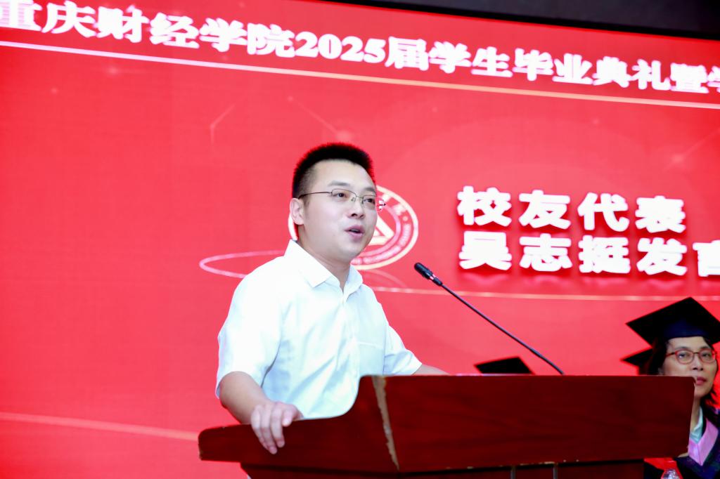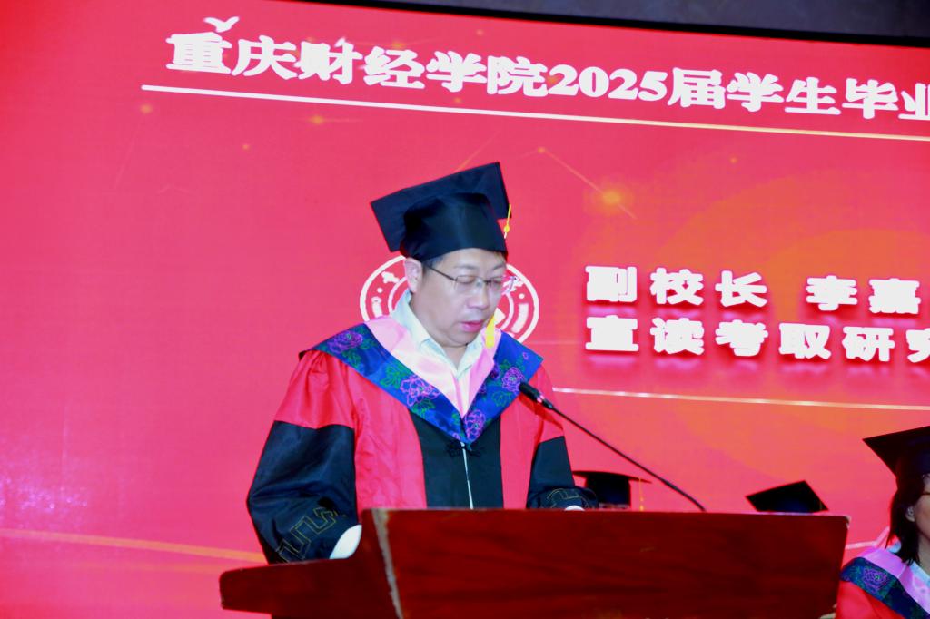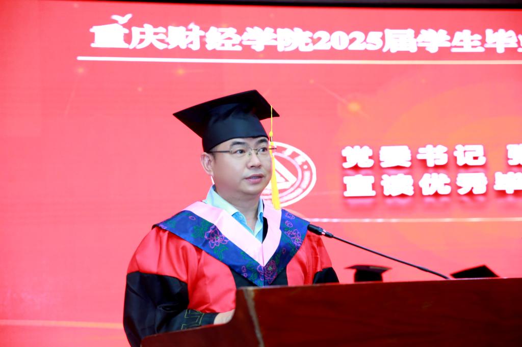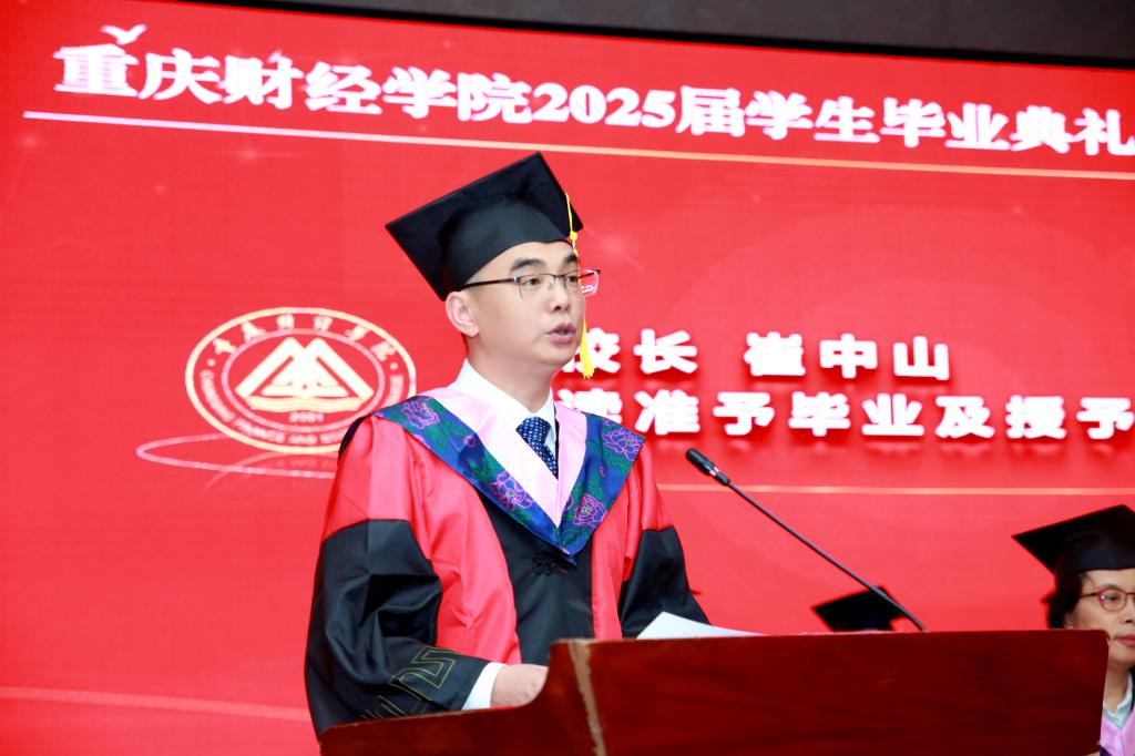 吴华安代表学校向师生致以衷心的感谢和诚挚的祝贺。面对即将踏上新征程的重财学子,他提出三点期望:一是做时代“逆行者”,到基层沃土“为中国式现代化建设贡献青春力量”;二是做人生“追光者”,既要“面包自由”更要“把日子过成自己想要的模样”;三是做母校“代言人”,未来以“大V”身份为学弟学妹内推机会,成为联结母校与社会的桥梁。他祝福毕业生“此去前程似锦,归来仍是少年”。