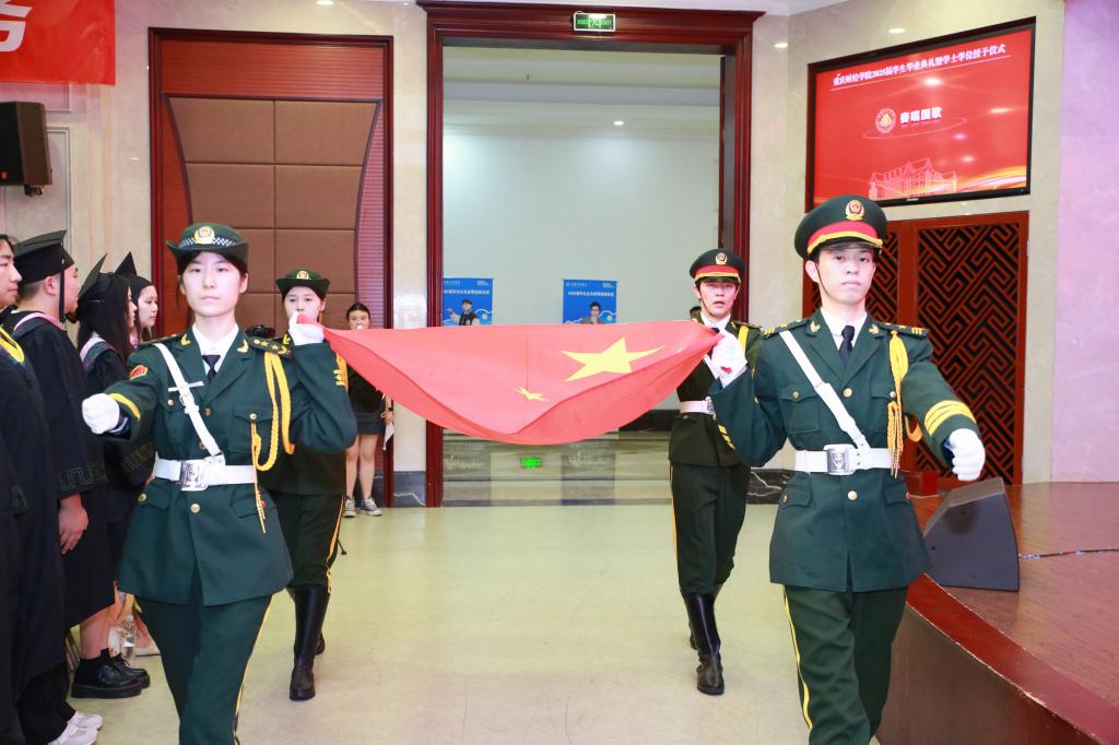 在庄严雄壮的国歌声中,毕业典礼拉开序幕,全场师生肃立齐唱,爱国荣校之情激荡胸怀。