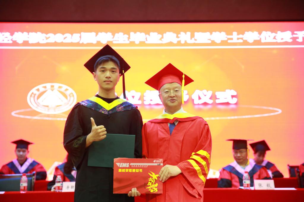毕业典礼上,张毅宣读《关于表彰2025届校级优秀毕业生的决定》、李嘉明宣读《关于对谭诗燕等178名考取硕士研究生的2025届毕业生予以奖励的决定》、崔中山宣读《关于准予2025届4695名学生毕业的决定》和《关于授予2025届4680名毕业生学士学位的决定》、陈旭宣读《关于表彰2025年浩燃奖学金获得者的决定》,台上校领导依次为获奖毕业生颁奖。