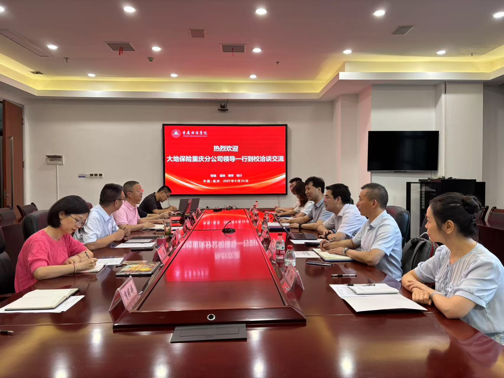 6月25日,中国大地保险重庆市分公司党委副书记宋涛率队与校长吴华安、副校长崔中山、金融学院院长贺晗及相关人员开展交流会。本次会议聚焦校企合作实施落地,围绕如何融入教学、如何培养学生、如何开展专题活动等方向展开务实探讨,推动合作从框架协议迈向实质实施阶段。