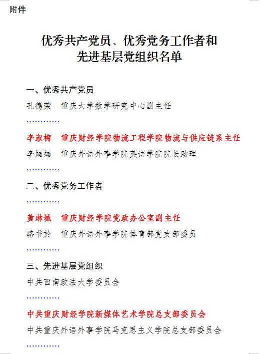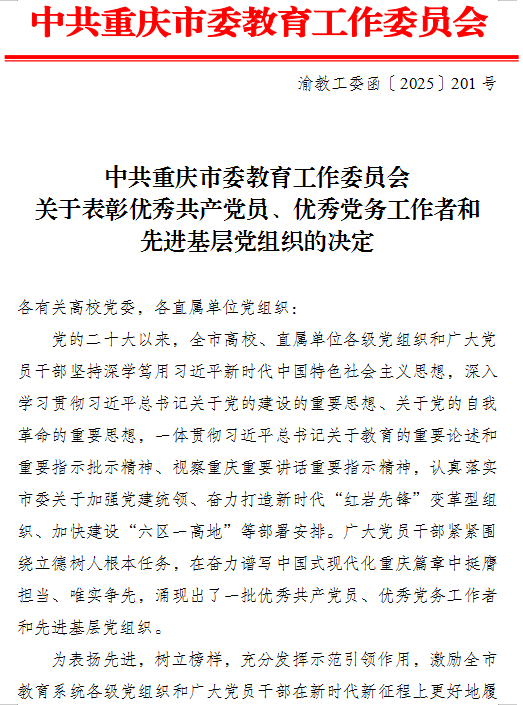 6月30日,在庆祝中国共产党成立104周年之际,重庆市委教育工委下发了《关于表彰优秀共产党员、优秀党务工作者和先进基层党组织的决定》,其中我校物流工程学院李淑梅同志获评优秀共产党员、党政办公室副主任黄琳城同志获评优秀党务工作者、新媒体艺术学院党总支获评先进基层党组织。