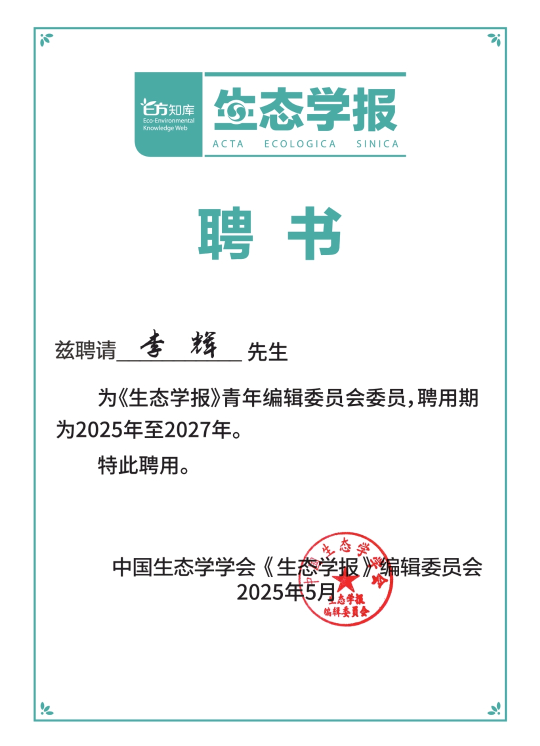 近期,国内生态学领域权威期刊《生态学报》公布了青年编辑委员会委员名单,我校李辉教授成功入选,聘用期为2025 年至 2027 年。