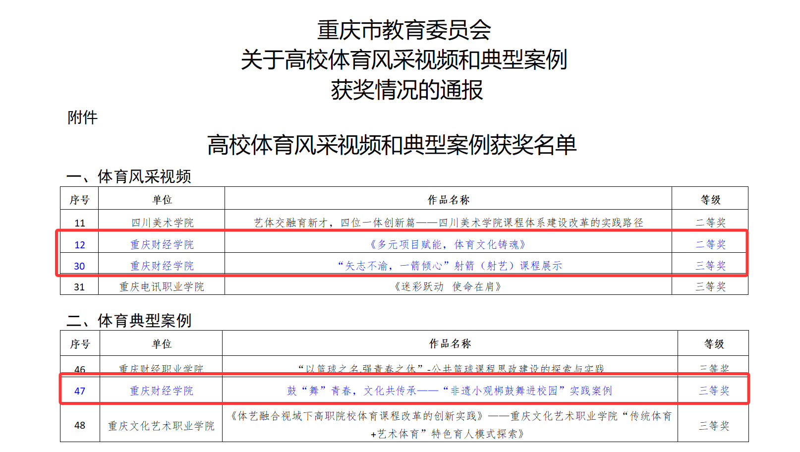 近日,重庆市教育委员会发布了2025年《关于高校体育风采视频和典型案例获奖情况的通报》。此次征集展示活动由重庆市教委主办,旨在全面展示重庆高校体育风采,推动校园体育建设。活动吸引了众多高校参与,竞争激烈。我校马克思主义学院积极组织、精心选送的作品在本次征集展示活动中表现优异,斩获“二等奖一项、三等奖两项”,充分展现了我校体育工作的丰硕成果和师生昂扬向上的精神风貌。