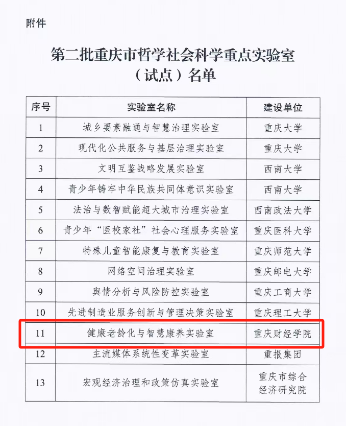 近日,中共重庆市委宣传部、重庆市教育委员会、重庆市社会科学联合会联合印发《关于公布第二批重庆市哲学社会科学重点实验室(试点)名单的通知》(渝委宣〔2025〕80号),我校牵头申报的“健康老龄化与智慧康养实验室”成功获批立项。我校成为重庆市哲学社会科学重点实验室建设试点以来首家入选的民办高校,也是全市同类高校中唯一同时获批自然科学和哲学社会科学市级重点实验室的高校。