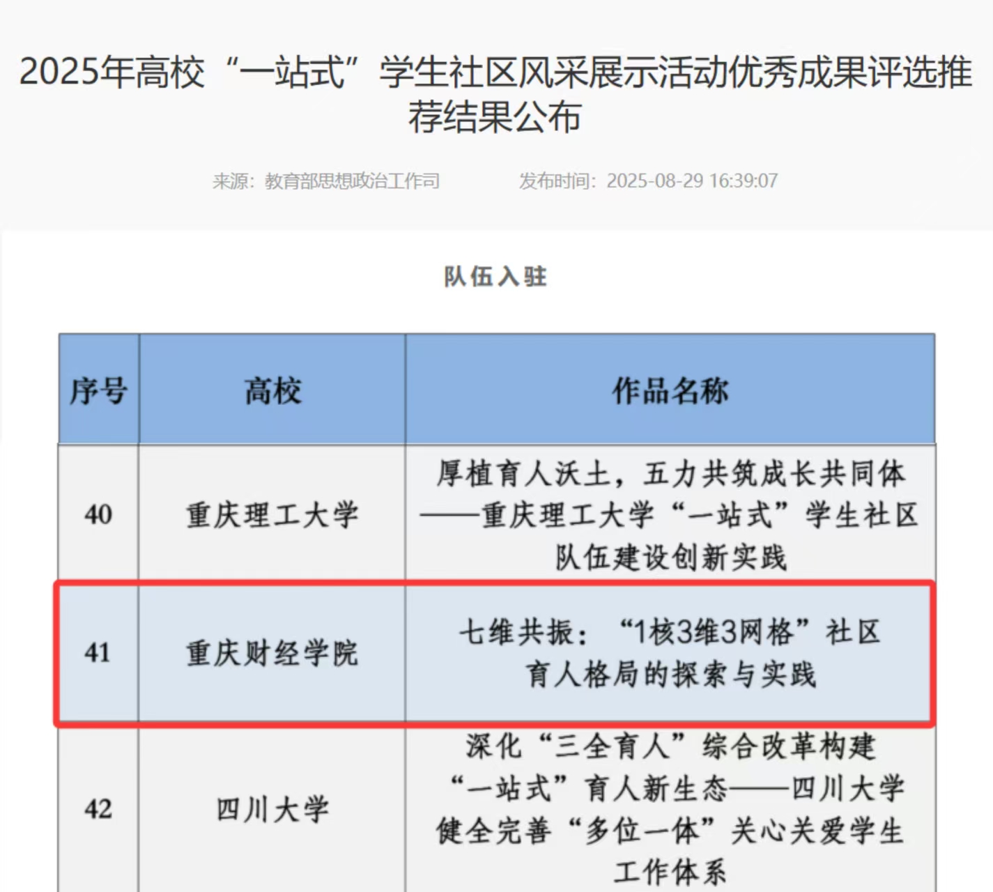 此次入选标志着我校在“一站式”学生社区建设中取得重要突破。下一步,学校将持续深化“1核3维3网格”社区育人体系,推动思政教育、管理服务与社区生活空间深度融合,为培养担当民族复兴大任的时代新人贡献力量。