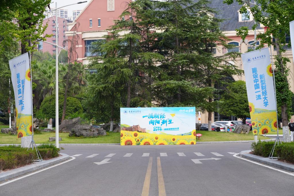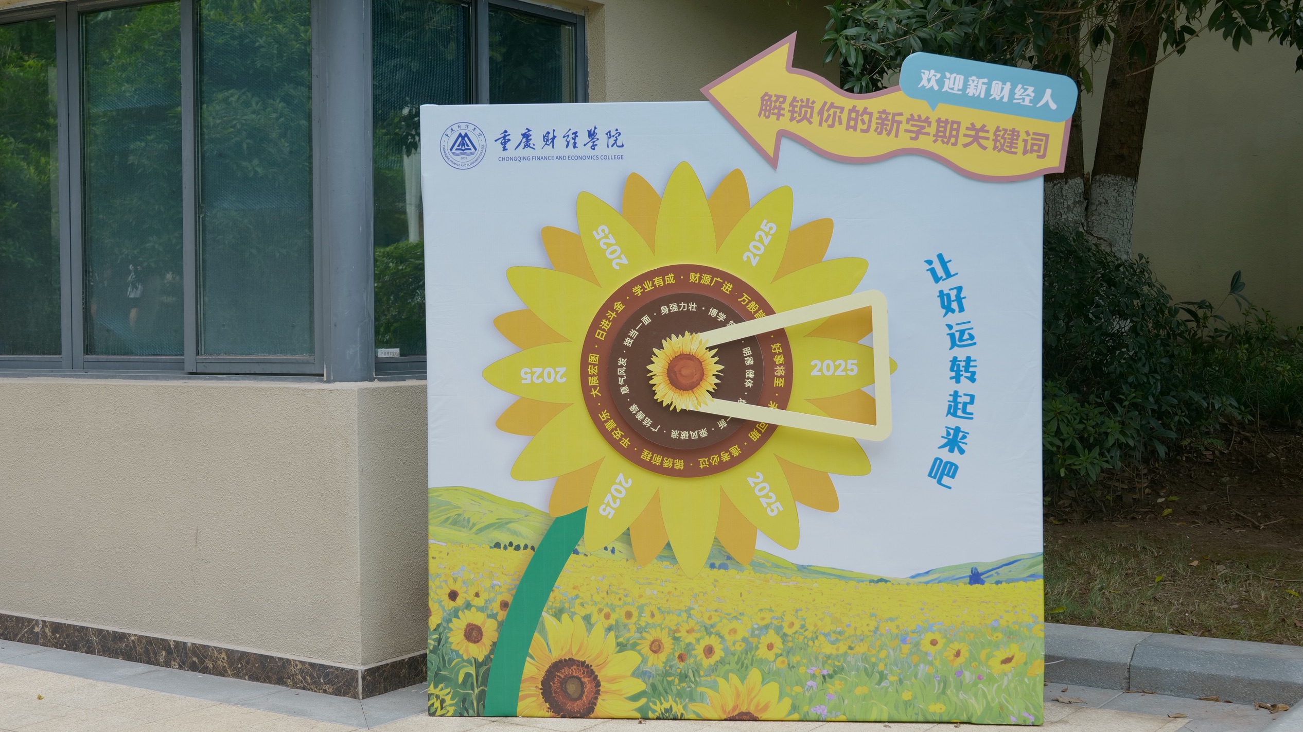 重财校园内,一流财经,向阳“新”生主题展板、道旗、学院横幅与互动转盘等打卡点错落排布,营造出欣欣向荣的开学氛围,引导新同学锚定学习方向、厚植校园情怀,助力新生快速融入、重拾专注学习状态。