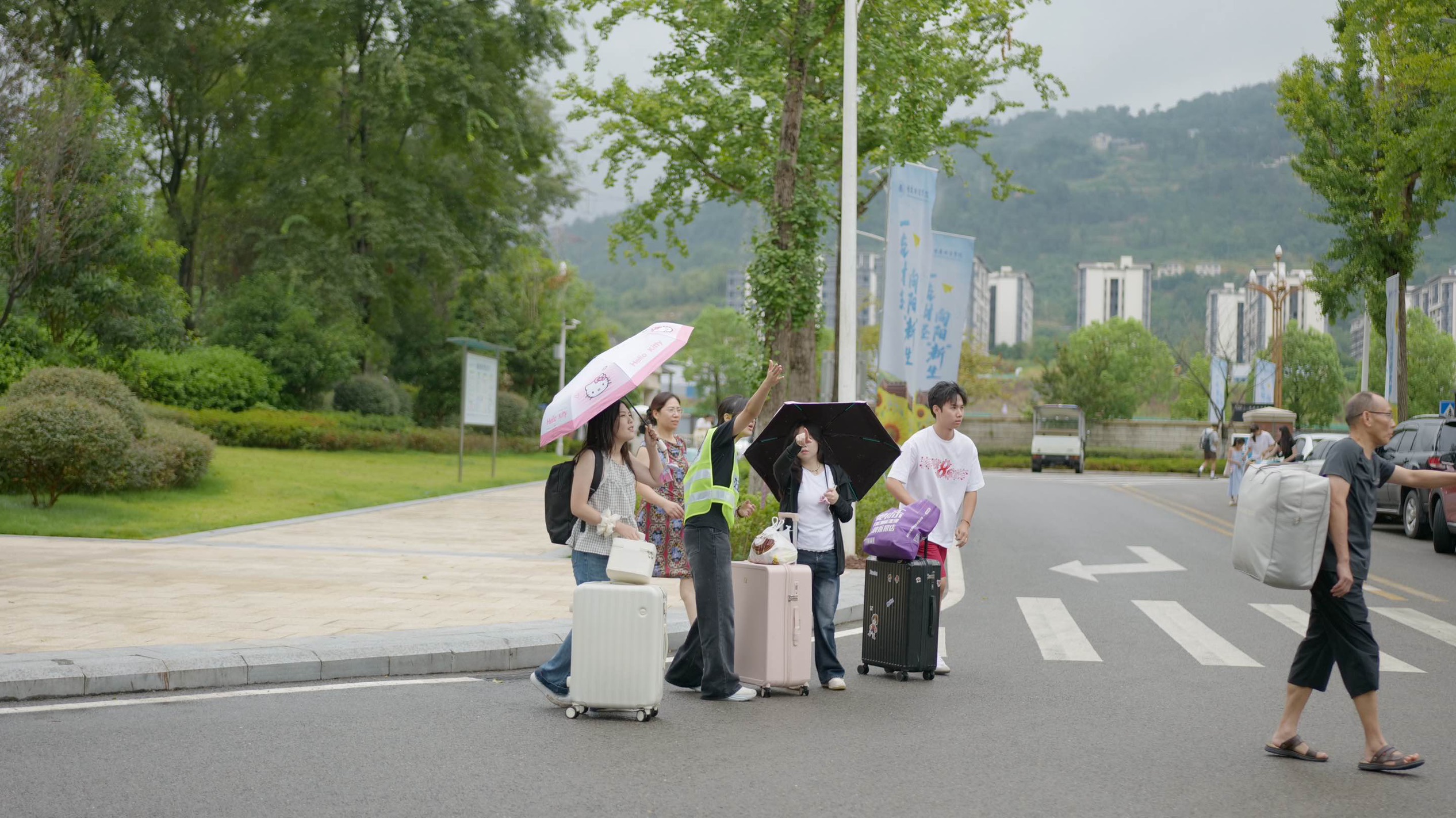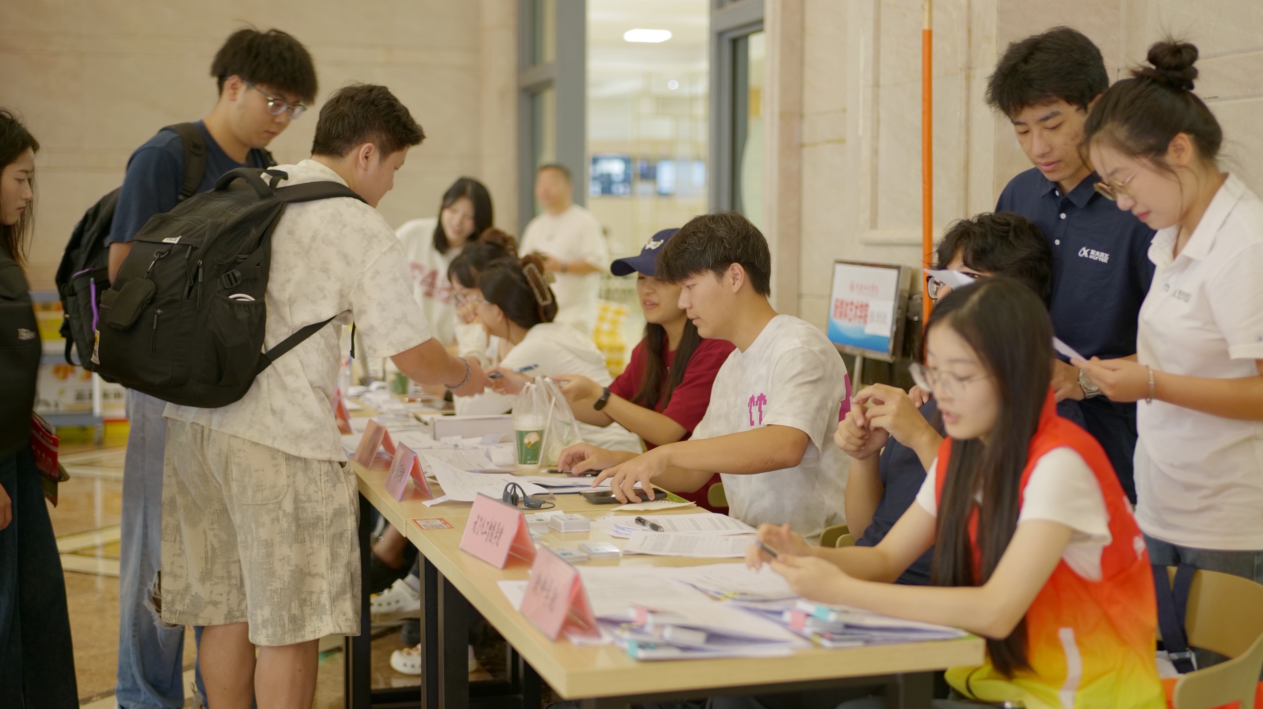 在迎新现场,学生志愿者提供报到指引、资料核验、行李搬运等服务;保卫处全员值守,加大校内安全巡逻力度并科学疏导校园周边交通;后勤处在各报到点设置便民饮水站、应急药品箱,传递校园温暖。